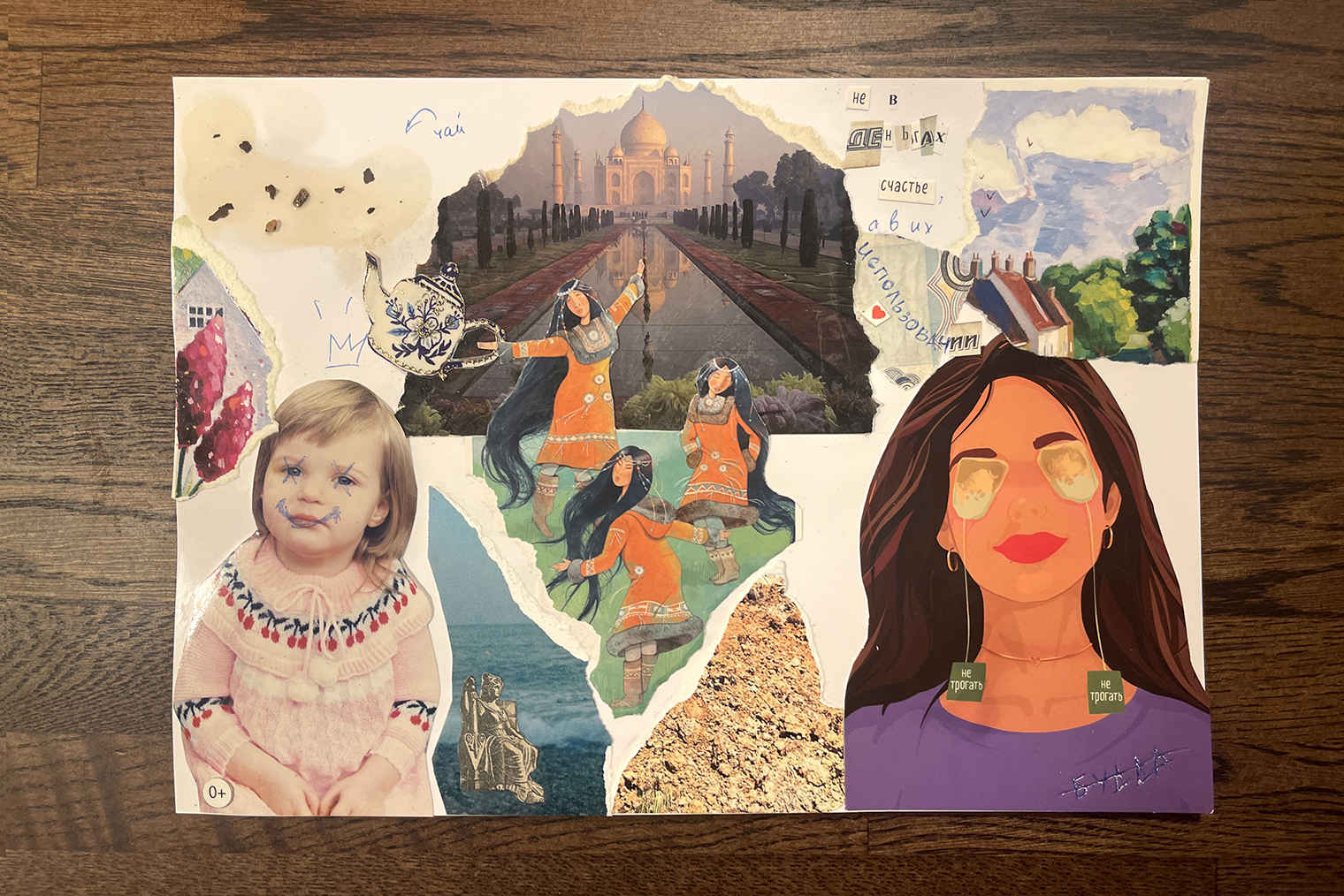 На самом деле, я не успела подготовить журналы. В последний момент вспомнила, что мне не из чего вырезать, поэтому нашла открытки и фотографии. В центре композиции — как раз две мои любимые открытки. На одной — Тадж-Махал, а на другой — танцующие девушки. Меня вдохновляют эти образы. Мне было жаль резать открытки, но они лежат у меня лет пять. Подумала, почему бы их не вклеить в коллаж?