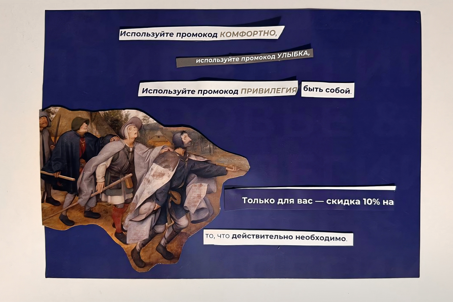 Еще для меня это попытка высказывания на тему антикапитализма: эти несчастные ребята с картины Брейгеля «Слепые» символизируют всех тех, кто оказался в западне трудоголизма и общества потребления и не видит жизни вокруг, а фразы с одной стороны отражают важные смыслы, но с другой — выглядят как издевка для людей, которым в силу обстоятельств приходится трудиться просто ради выживания.