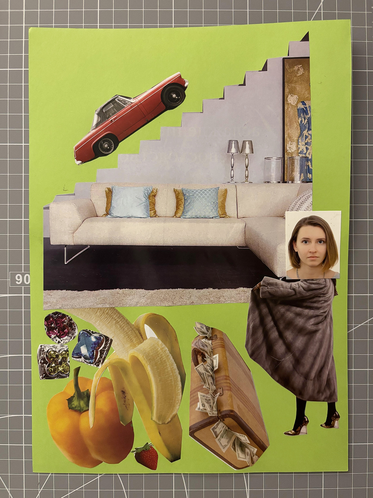 Я нашла диван, который выглядит явно дорого. Позволила себе наклеить свое лицо на женщину в шубе. Еще на коллаже есть машина — она для меня в целом не так важна, но пусть тоже будет. И внизу композиции, у моих ног, — немного драгоценностей и чемодан с деньгами. Еще я слышала, что фрукты и овощи будут стоить дорого, поэтому добавила их побольше.