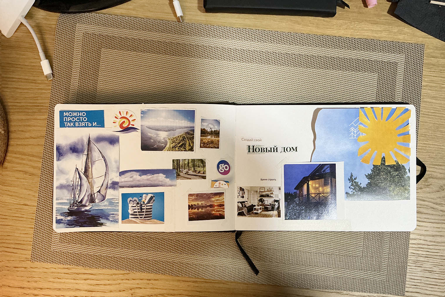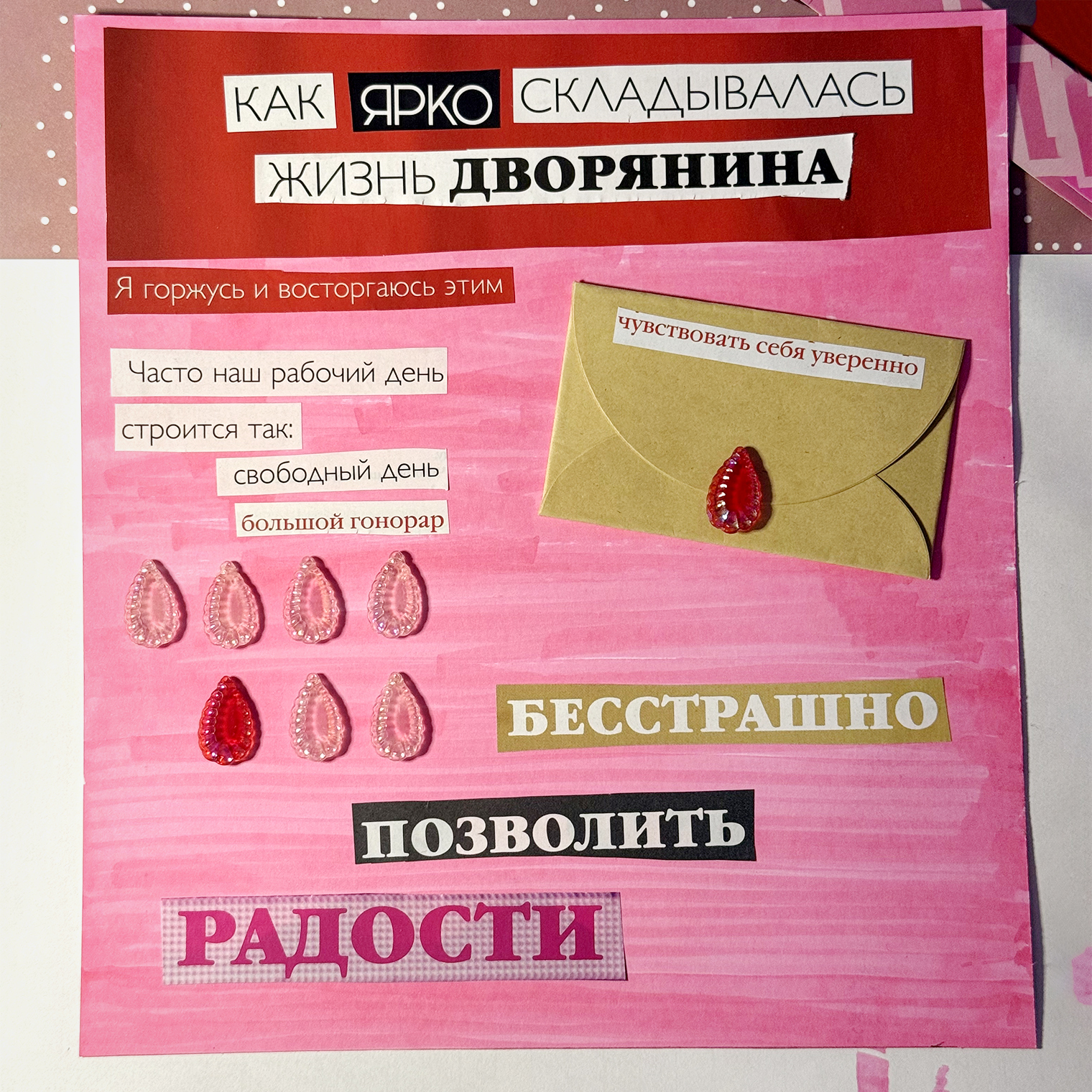 Я мечтаю о роскошной жизни — ну или хотя бы обеспеченной. Хочу, чтобы мой рабочий день ощущался как выходной, ведь я буду любить свою работу. На коллаже есть конверт, а в нем — то, что помогает мне чувствовать уверенность в завтрашнем дне. Хочу перестать винить себя за то, что трачу деньги на маленькие и большие радости.