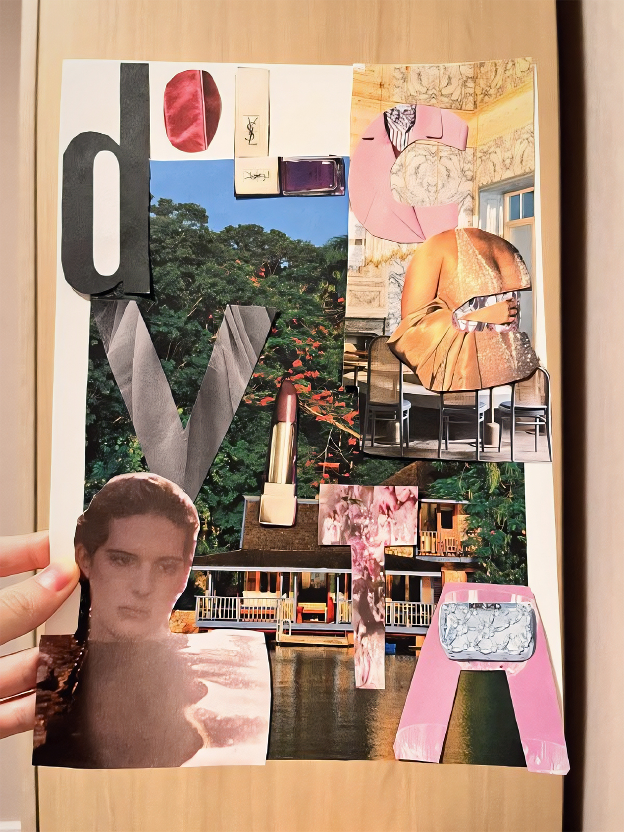 Затем я решила, что нужно дополнить коллаж какой-то фразой, и в голову пришло dolce vita. Тем более журнал на французском языке, составить фразу на русском было бы непросто. В итоге я потратила минут 15 на то, чтобы найти и вырезать подходящие буквы, а потом поняла, что они слишком маленькие и коллаж с ними выглядит куце. Совсем не дольче вита! Решила сделать буквы побольше из различных кадров и текстур, изображенных в журнале. Так, буквой Е стала фотография Шер, L была собрана из лаков, а вместо I я приклеила помаду. По-моему, вышло роскошно.