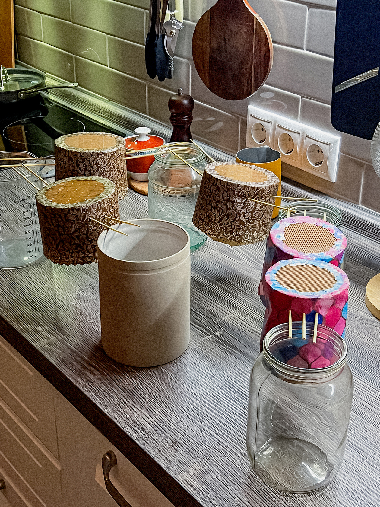 Заниматься куличами я начала утром, а закончила только к полуночи. Чтобы они остались пышными и воздушными, после выпекания нужно провернуть небольшой трюк и подвесить их вверх дном — пришлось сооружать странную конструкцию из банок и деревянных шпажек. А на следующий день еще взбивать меренгу для украшения.