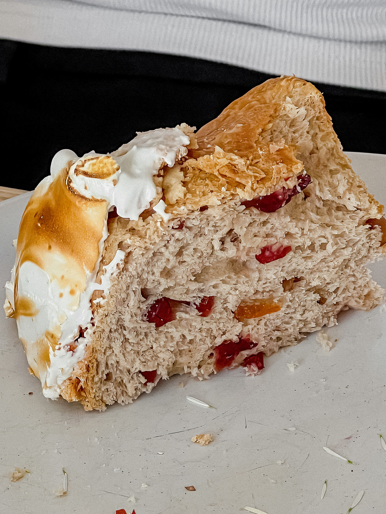 Мой друг делает такую выпечку к Пасхе каждый год. Я решила перенять эту традицию и попросила рецепт. Хоть его версия панеттоне оказалась не такой замороченной, как традиционная, этапов и нюансов было так же много, как сливочного масла в тесте. Подготовка сухофруктов, опара, несколько замесов, расстойка, формовка, приготовление хрустящей ореховой шапочки-макаронада — и это я еще даже духовку не включила.