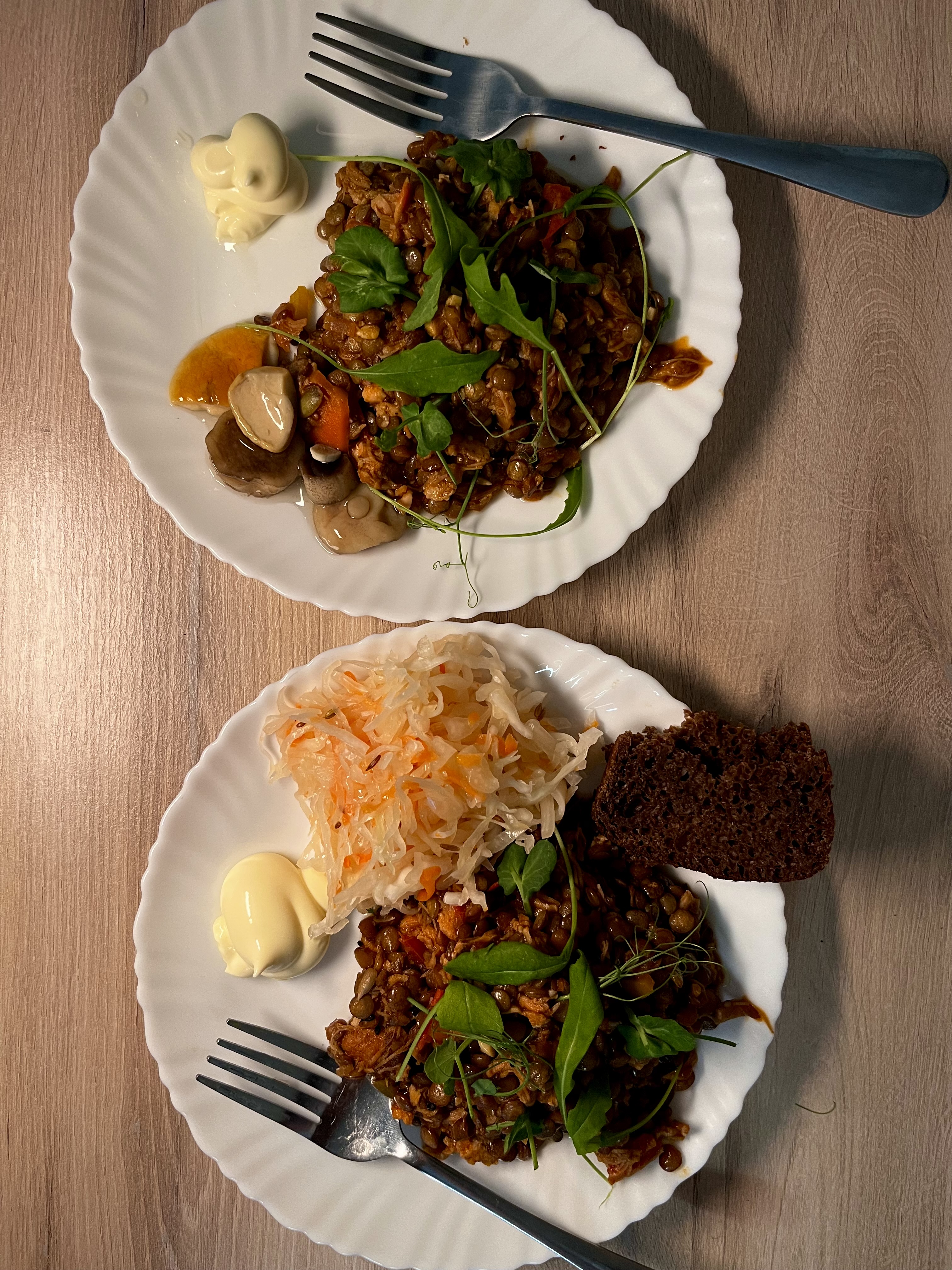 Чечевицу лучше пробовать: важно, чтобы она была готовой, но плотной, как «аль денте». Когда чечевица дойдёт до нужной кондиции, смешиваем её с заправкой в сковороде. Ещё немного подсолим, добавим молотый перец и красную острую паприку.