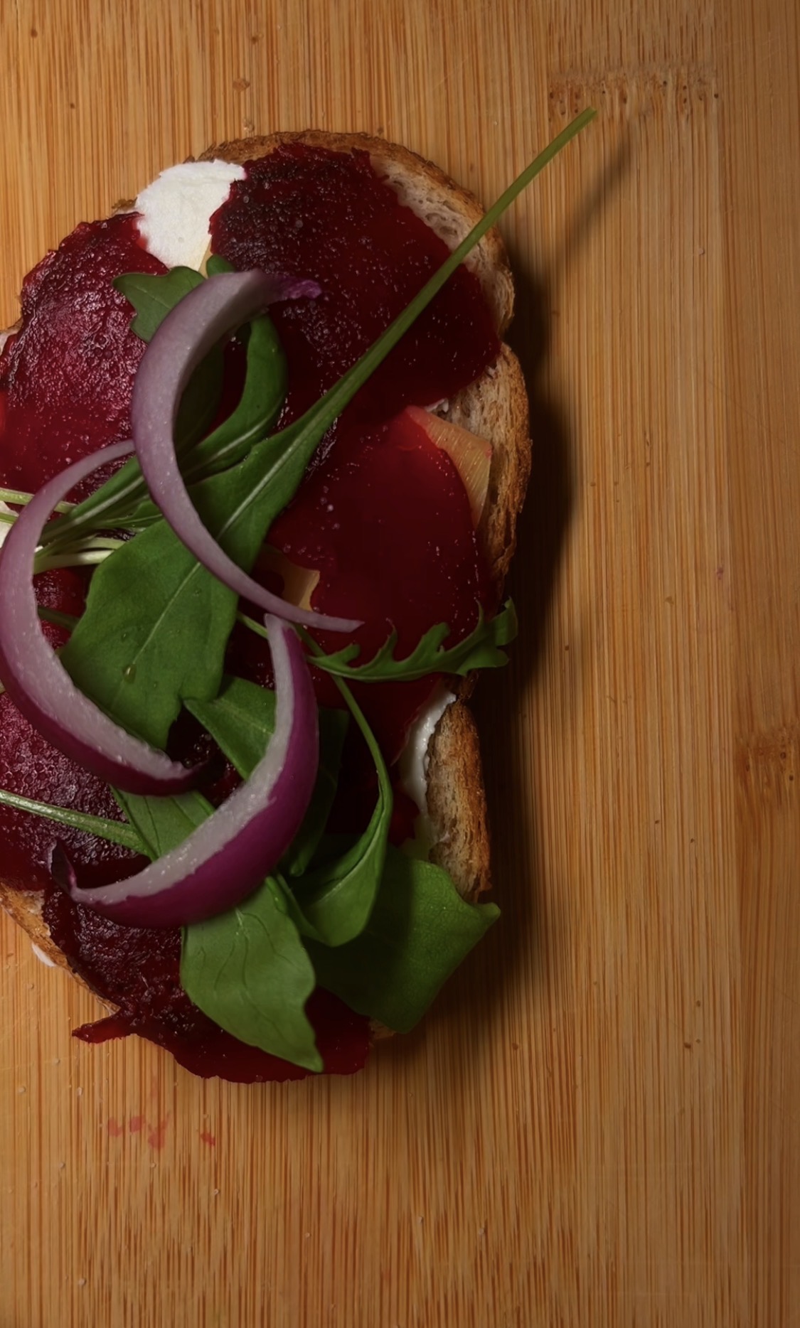 Добавьте горсть свежей рукколы для остринки и бальзамический уксус — буквально пару капель, чтобы подчеркнуть сладость свеклы и горчинку зелени.