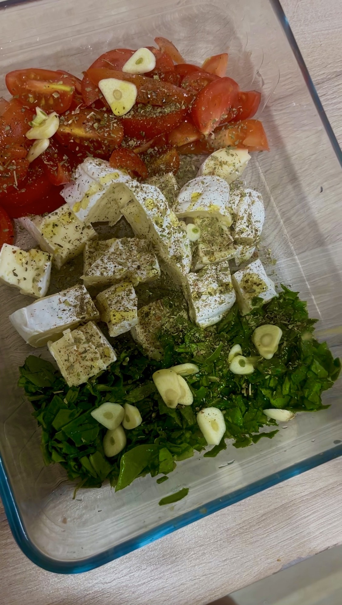- В форму выложи шпинат (резать или нет — на ваш вкус, я режу), половинки черри (10–15 шт.), дольки чеснока (2–3 зубчика) и целый камамбер нарезанный сеткой или кусочками.