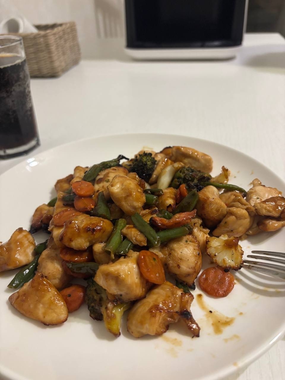 - Курица с овощами в соусе терияки — купил замороженные овощи, разморозил, грудку нарезал, замариновал в соусе терияки + немного соевого, овощи тоже полил им, все выложил на решетку и в аэрогриль.