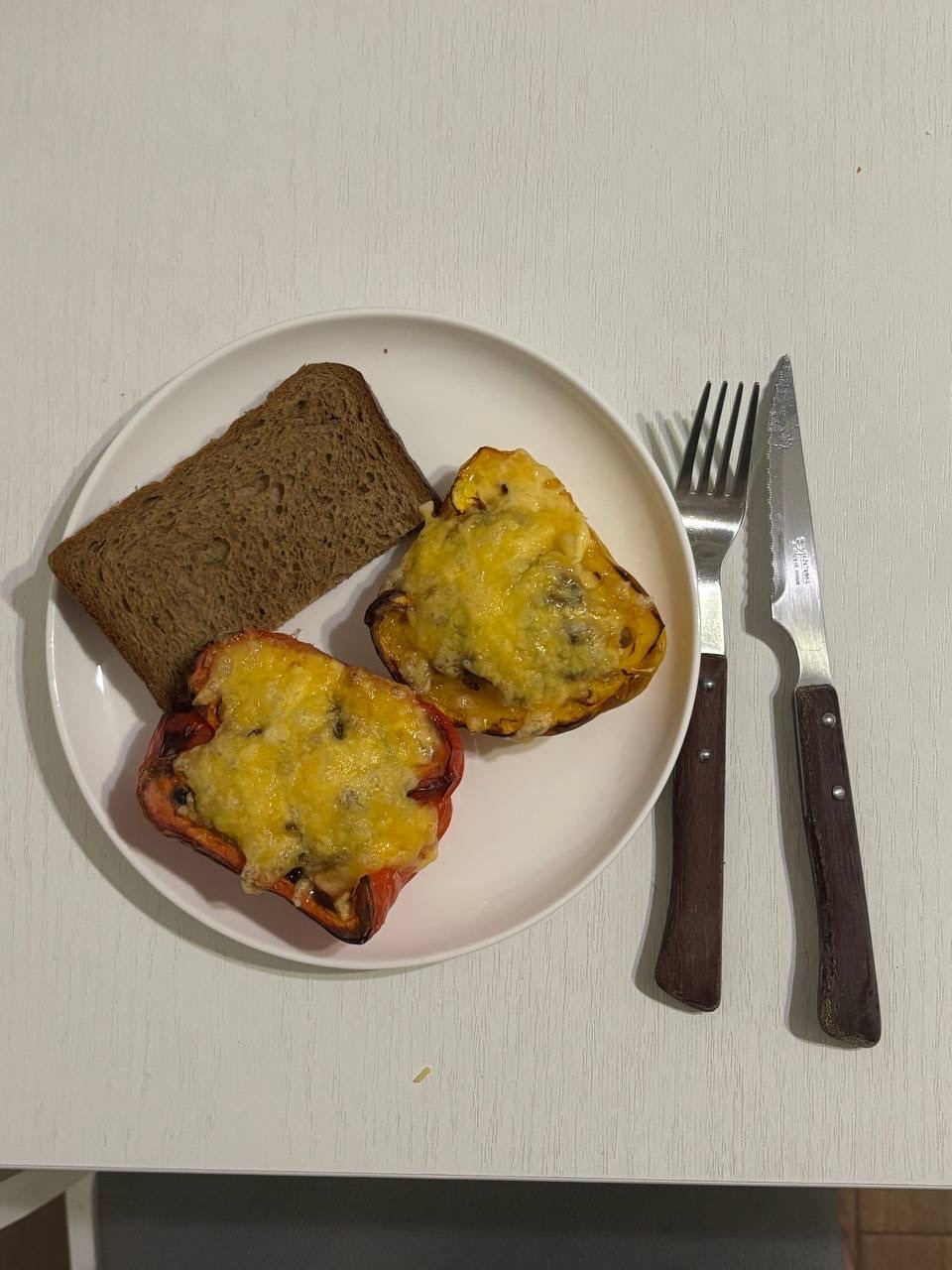- Фаршированные перцы — я всегда очень любил, как их готовила моя мама: с бульончиком и сметаной. Тут решил сделать проще — нарезал перцы пополам, туда засунул фарш, сверху выложил мелко нарезанные грибы и помидоры, посыпал сыром.