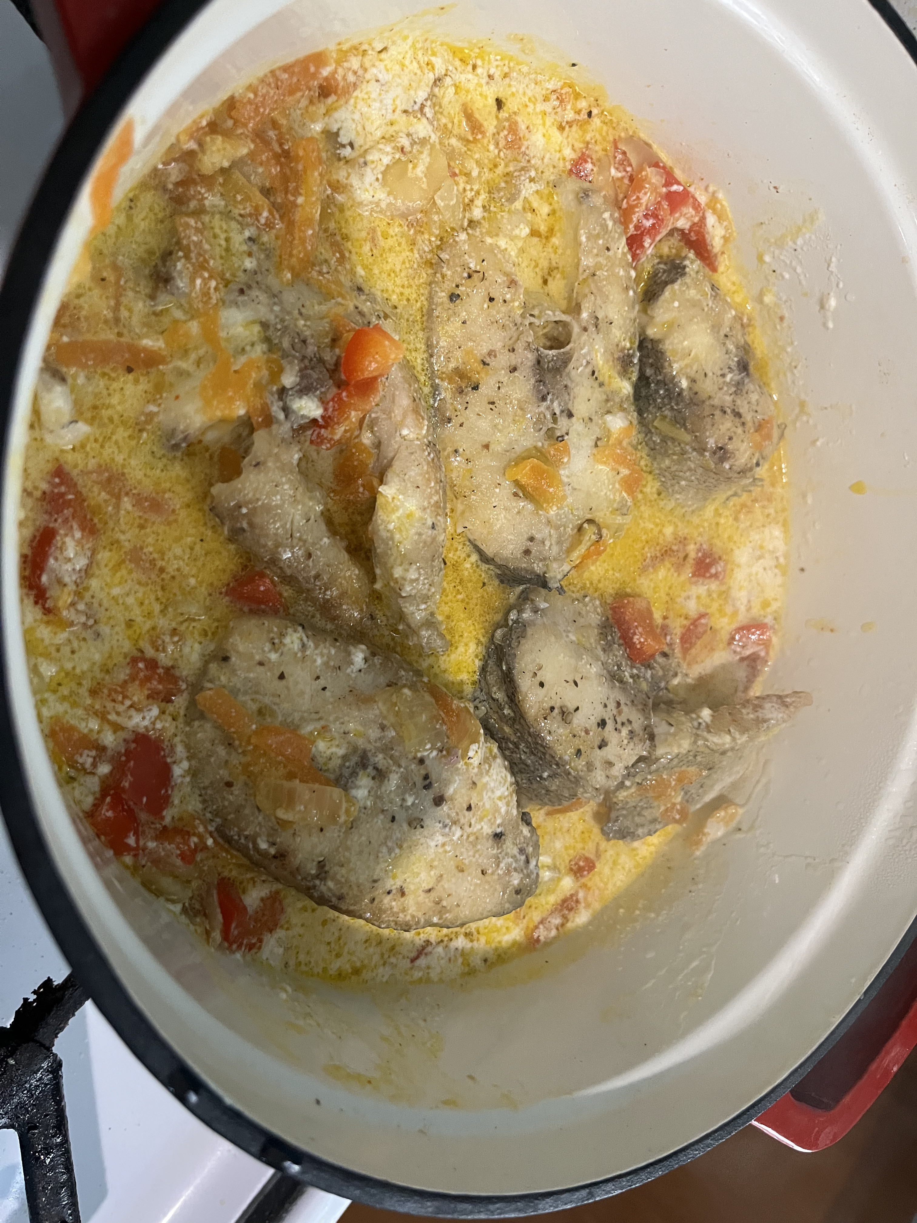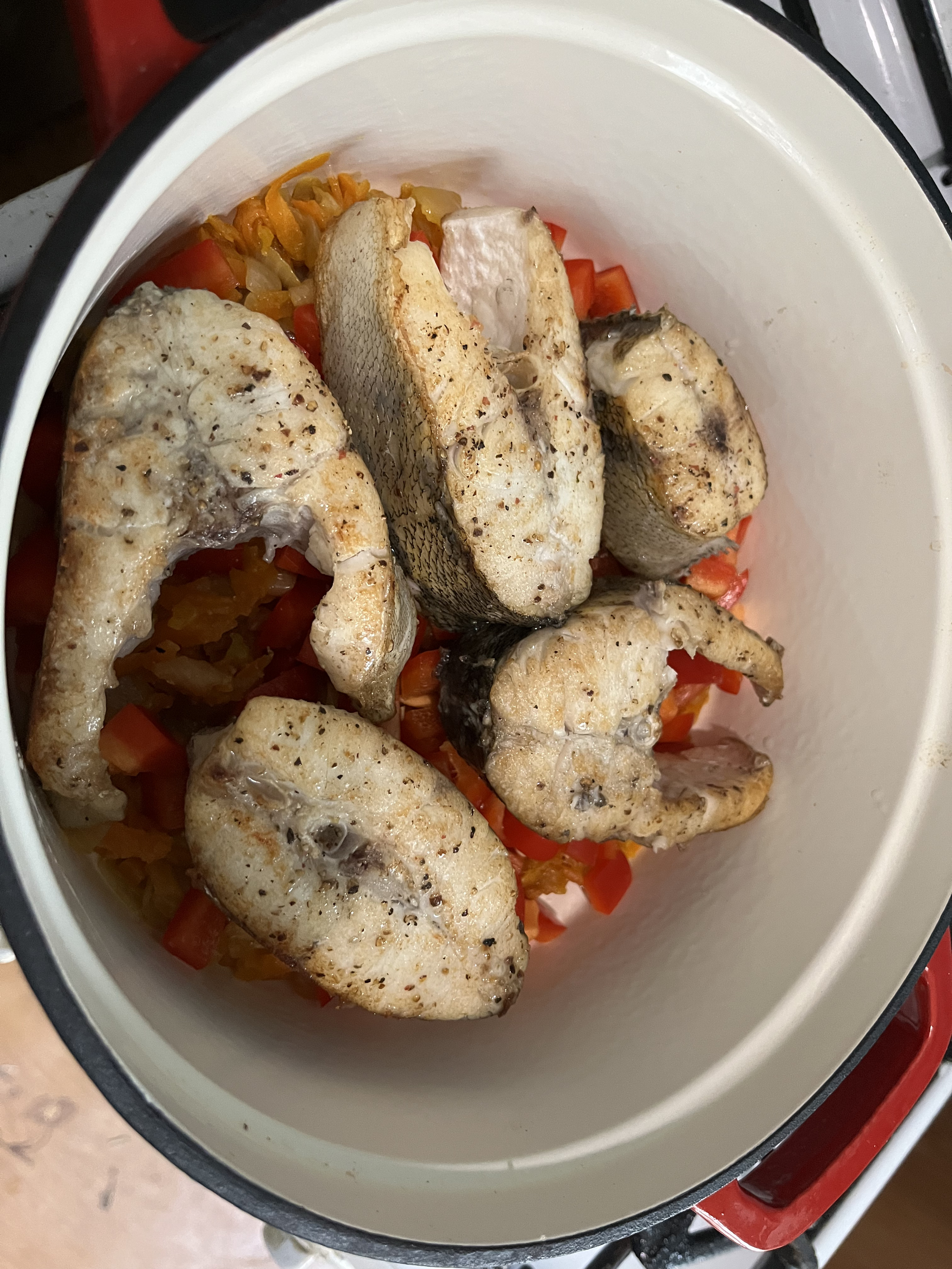 В посуду для тушения на дно укладываю зажарку, туда же порезанный болгарский перец, а сверху обжаренного со всех сторон судака. Сметану смешиваю с водой один к одному, добавляю туда немного специй и перец, чеснок хорошо бы еще зашел, но у меня не было. Получившейся смесью заливаем рыбу и тушим 10 минут на минимальном огне с приоткрытой крышкой.