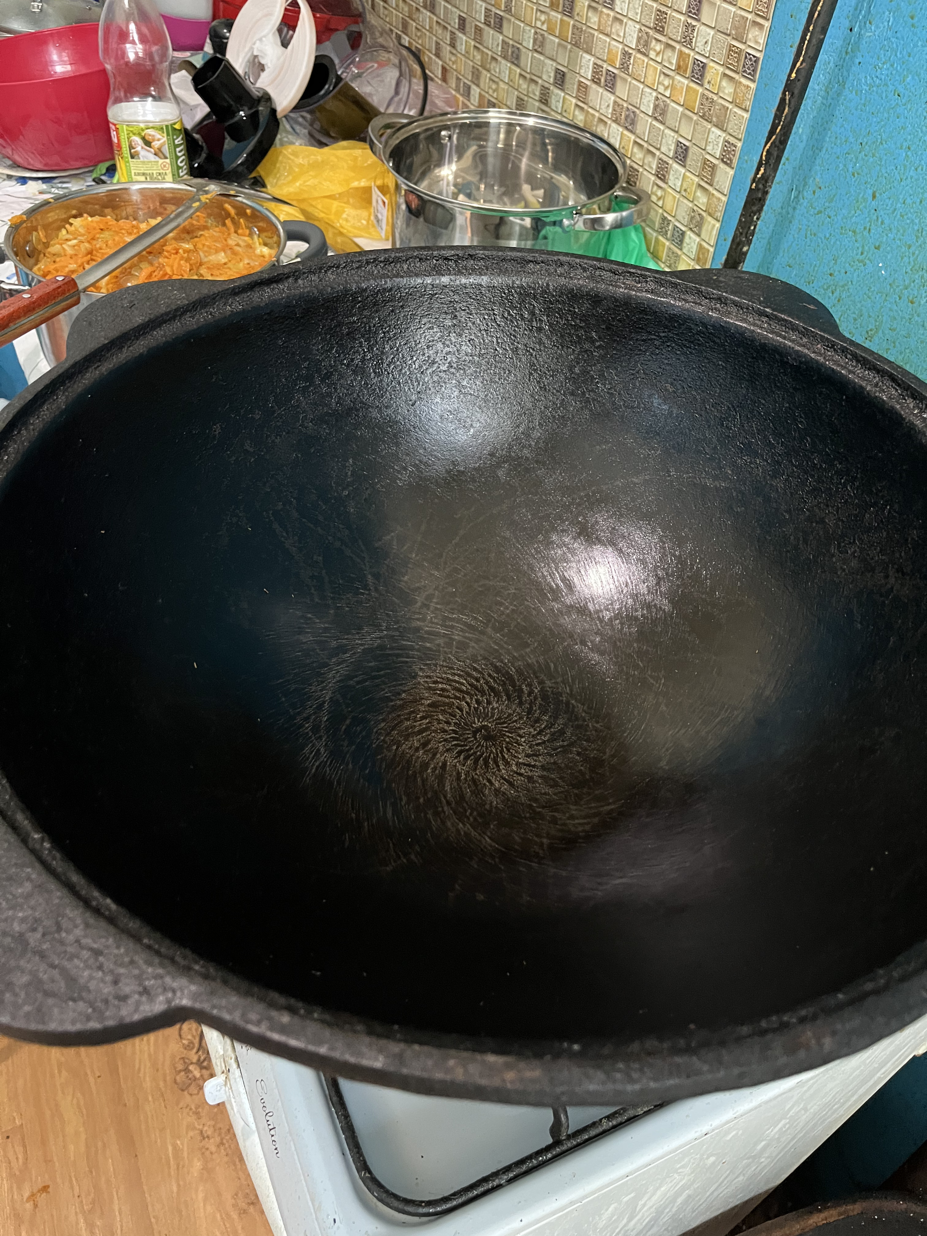 На приготовление зажарки ушло примерно пол часа на максимальном огне, так же добавил пол пачки сливочного масла для вкуса. Готовую зажарку из казана сразу перекладываю в кастрюлю — пока казан горячий проще всего его обслужить и убрать. Благо тут ничего сложного — ничто не пригорело и отмывать не надо, ополаскиваю казан кипятком от остатков овощей, вытираю бумажным полотенцем и все, казан остается покрыт небольшим количеством вкусного овощного масла и это идеально для его хранения.