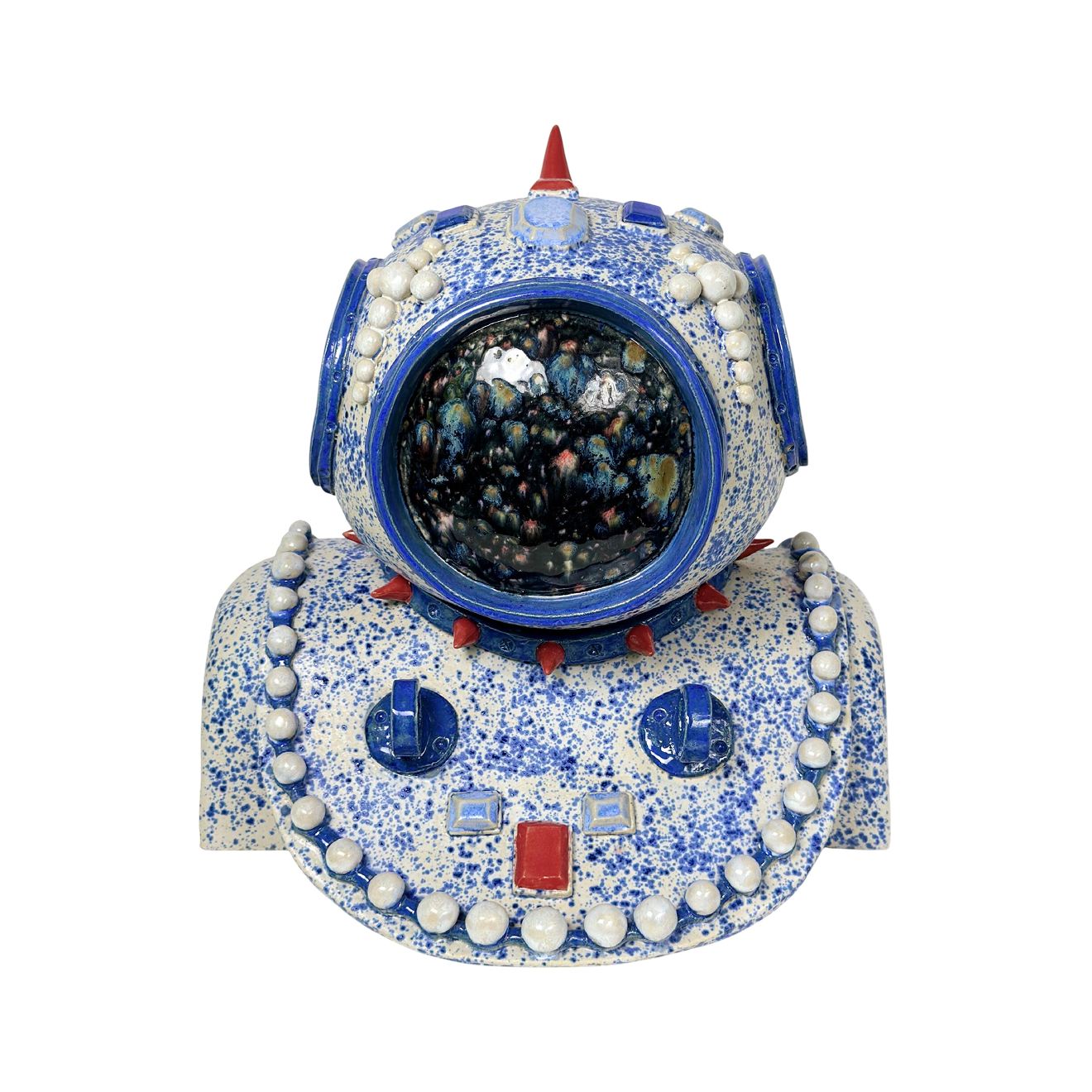 Я люблю отлетевшую и тактильную керамику, чтобы глаз за нее цеплялся и можно было трогать текстуры. Тут и панковские иглы, и византийские кресты, и кнопки-камни, и запекшиеся подтеки краски. Мне нравится описание этой скульптуры художницы Ольги Фониной: «Это видимый объект невидимой человеческой суперсилы — самозащиты внутреннего мира от изменений внешних обстоятельств и бесконечного потока информации». Остро необходимая вещь — оберег, талисман