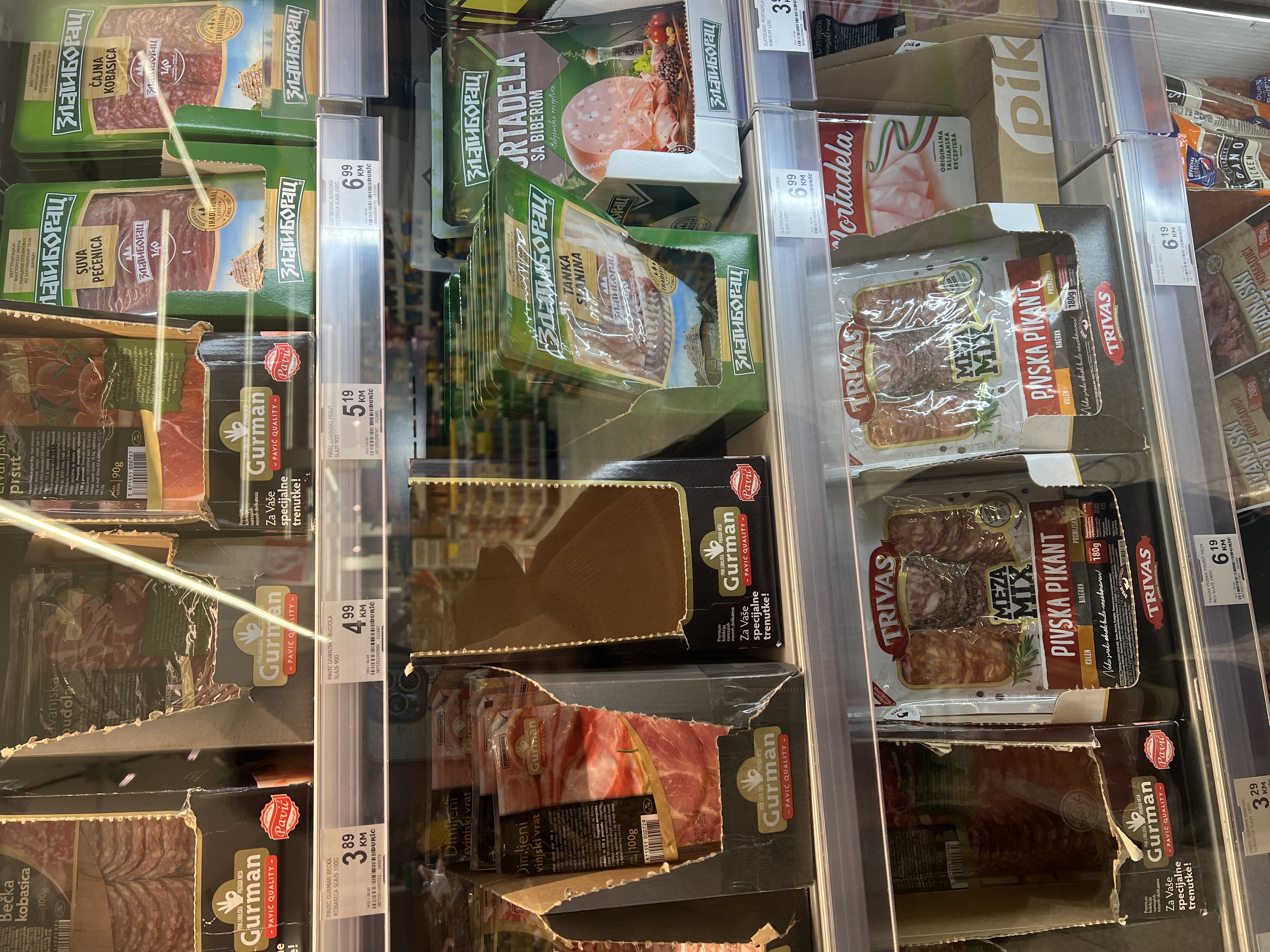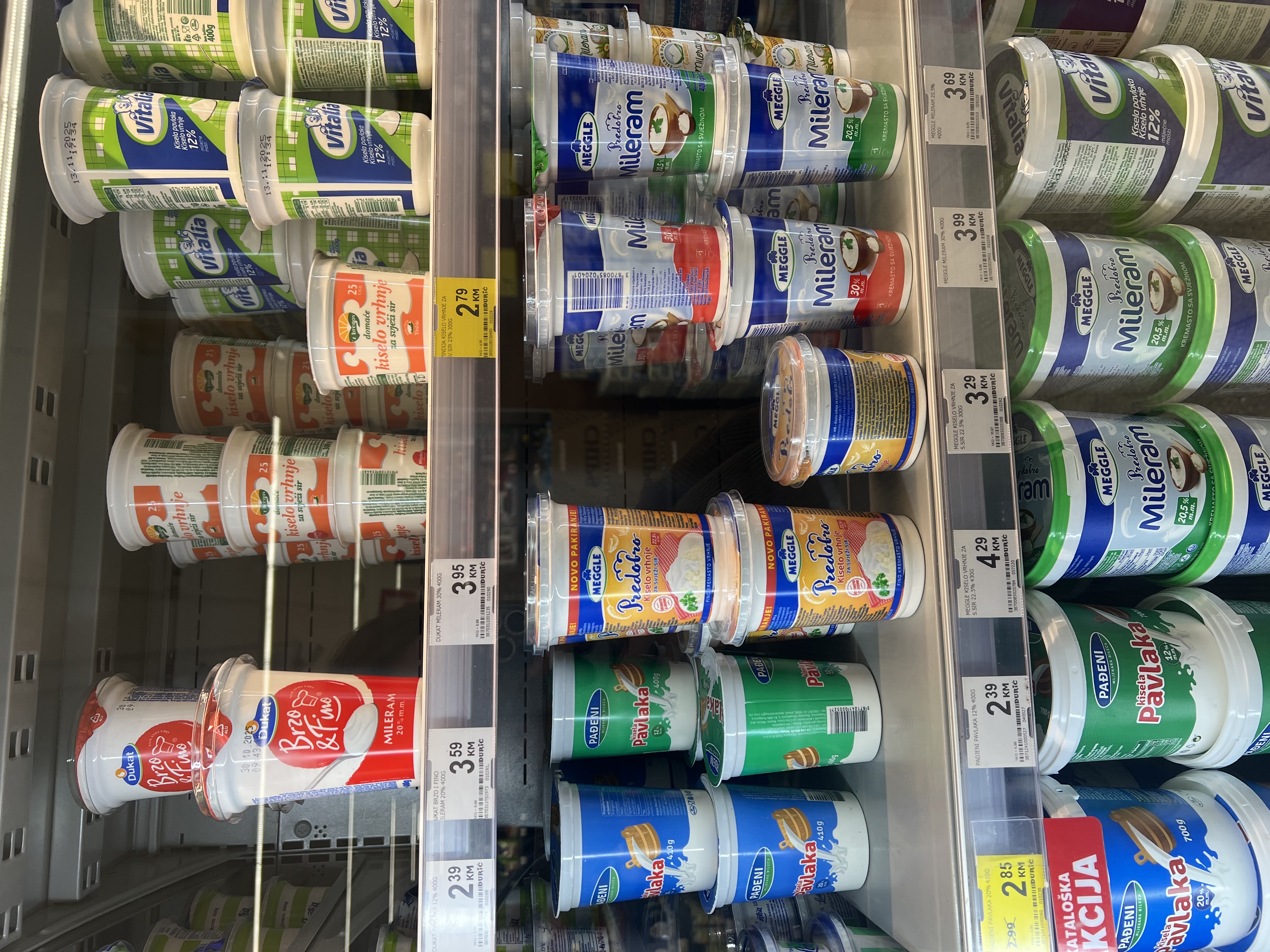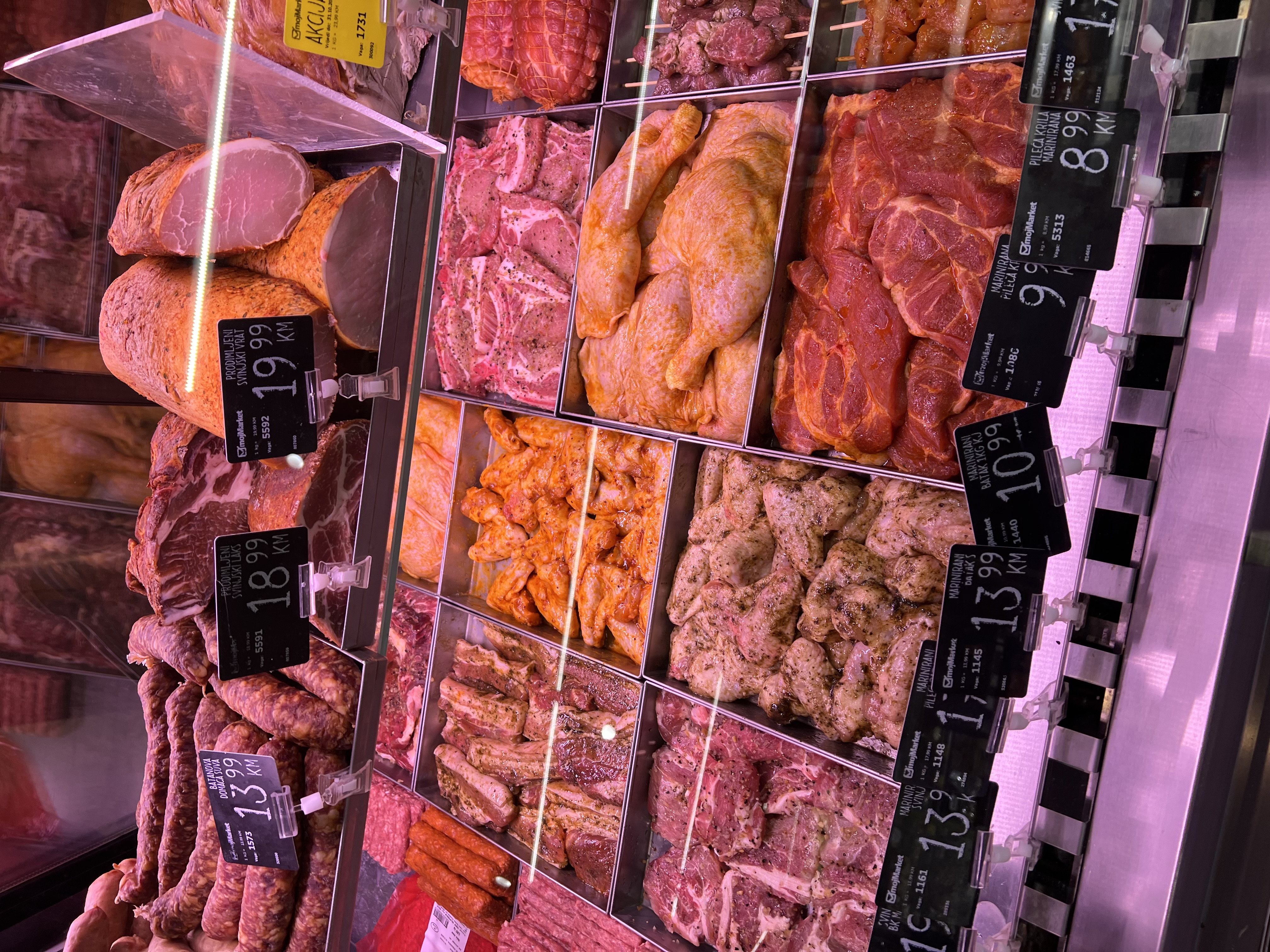 На фотографиях можно увидеть ассортимент продукции в местных супермаркетах и ознакомиться с актуальными ценами. Цены указаны по состоянию на осень 2025 года в местной валюте (конвертируемой марке). Для примерного пересчёта в рубли стоимость нужно умножать на 50. В магазинах представлен широкий выбор продуктов из европейских стран, так как в самой Боснии и Герцеговине практически нет собственного производства. Пищевая промышленность развита слабо, крупных заводов немного.