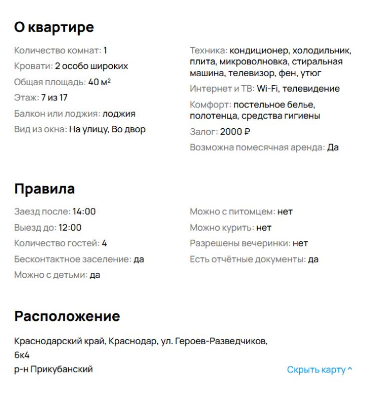 Описание наполнения квартиры тоже должно совпадать с фото: если указано, что кроме кровати есть раскладной диван, его должно быть видно на фото. При необходимости в некоторых сервисах, например на «Авито», можно связаться с хозяином квартиры для уточнения деталей перед бронированием или внесением оплаты.
