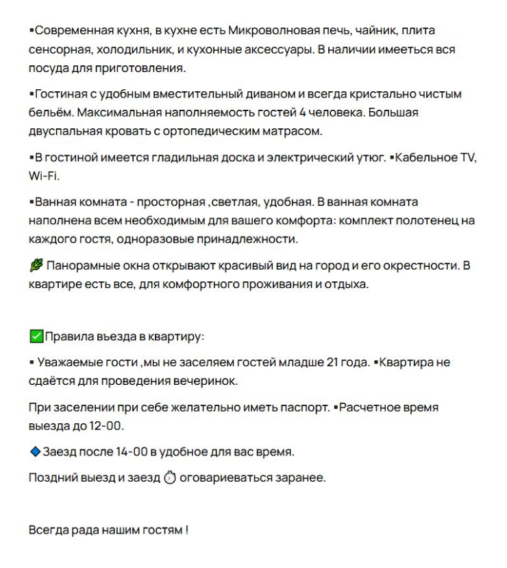 - Как проходит заселение: нужно ли позвонить заранее, смогут ли заселить в нужное время, как перевести залог и как действовать при выезде.