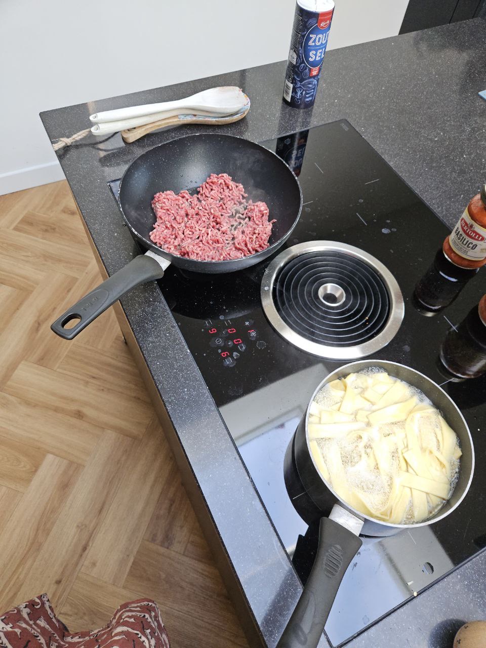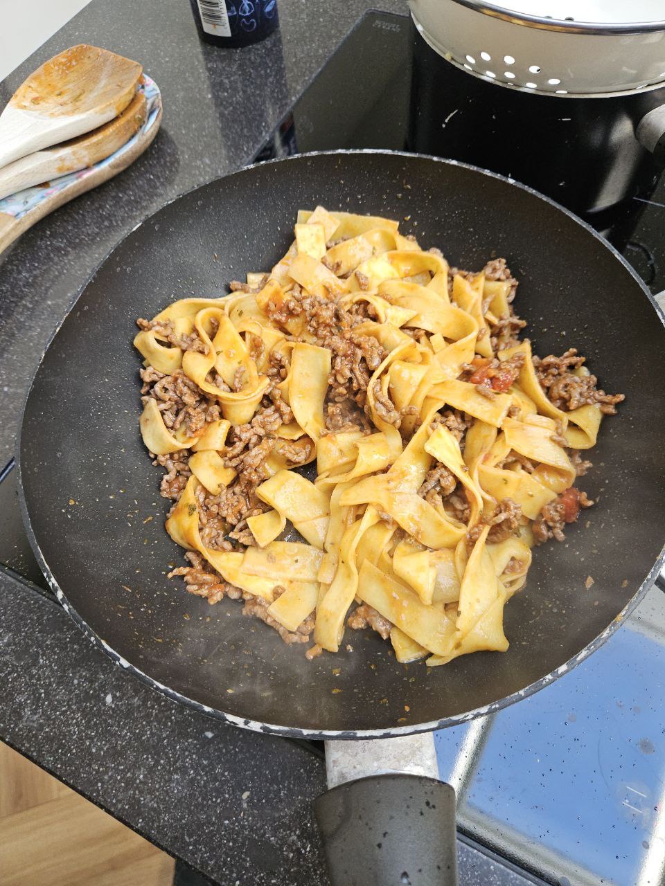 В 13:30 уже дома, делаю дежурную pasta al ragu, за пределами Италии называемую болоньезе. В кастрюлю заливаю кипяток из крана, свежая, не сухая, паста варится четыре минуты, за это же время обжаривается фарш, а соус я беру готовый. На всю готовку уходит около десяти минут. Катя как раз приехала из аэропорта, за обедом успеваем обменяться новостями за те несколько дней, что ее не было дома.