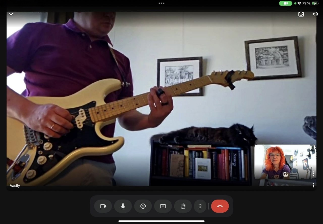 В 14 часов у меня урок. В прошлом я активно занимался музыкой, в Москве играл в группе. Сейчас ее участники разъехались по миру, а здесь постоянной команды пока не сложилось, и я стараюсь поддерживать навык занятиями с учителем. Гитаристка Елена Сигалова двадцать лет назад учила меня азам игры на электрогитаре очно в Москве, а в последние годы уже онлайн помогла восстановить руку после травмы и не растерять уровень игры. За часовое занятие успеваю стряхнуть сонливость и немного переключиться.