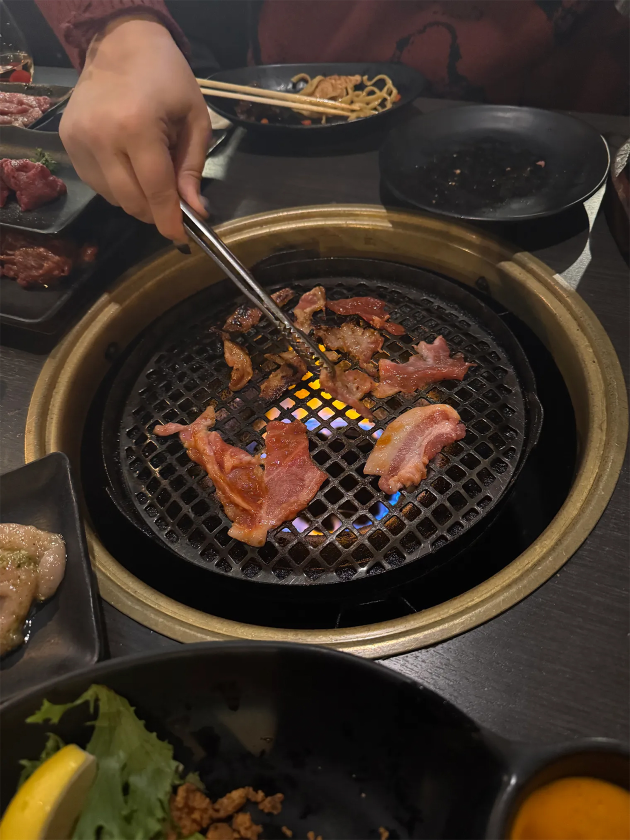 В 12:20 мы сели в Guy-Kaku. Обожаю это место: там вкусная еда и свежее мясо, которое можно обжаривать самостоятельно. Взяли сет на четверых и бутылку сливового вина. Еду приносили этапами: сначала мы жарили говядину, потом — свинину, а в конце — курицу и креветки. В середине пира муж ушел домой: ему надо было делать домашнее задание для университета. Мы с друзьями остались дожаривать и доедать, обсуждали их недавнюю поездку в Россию