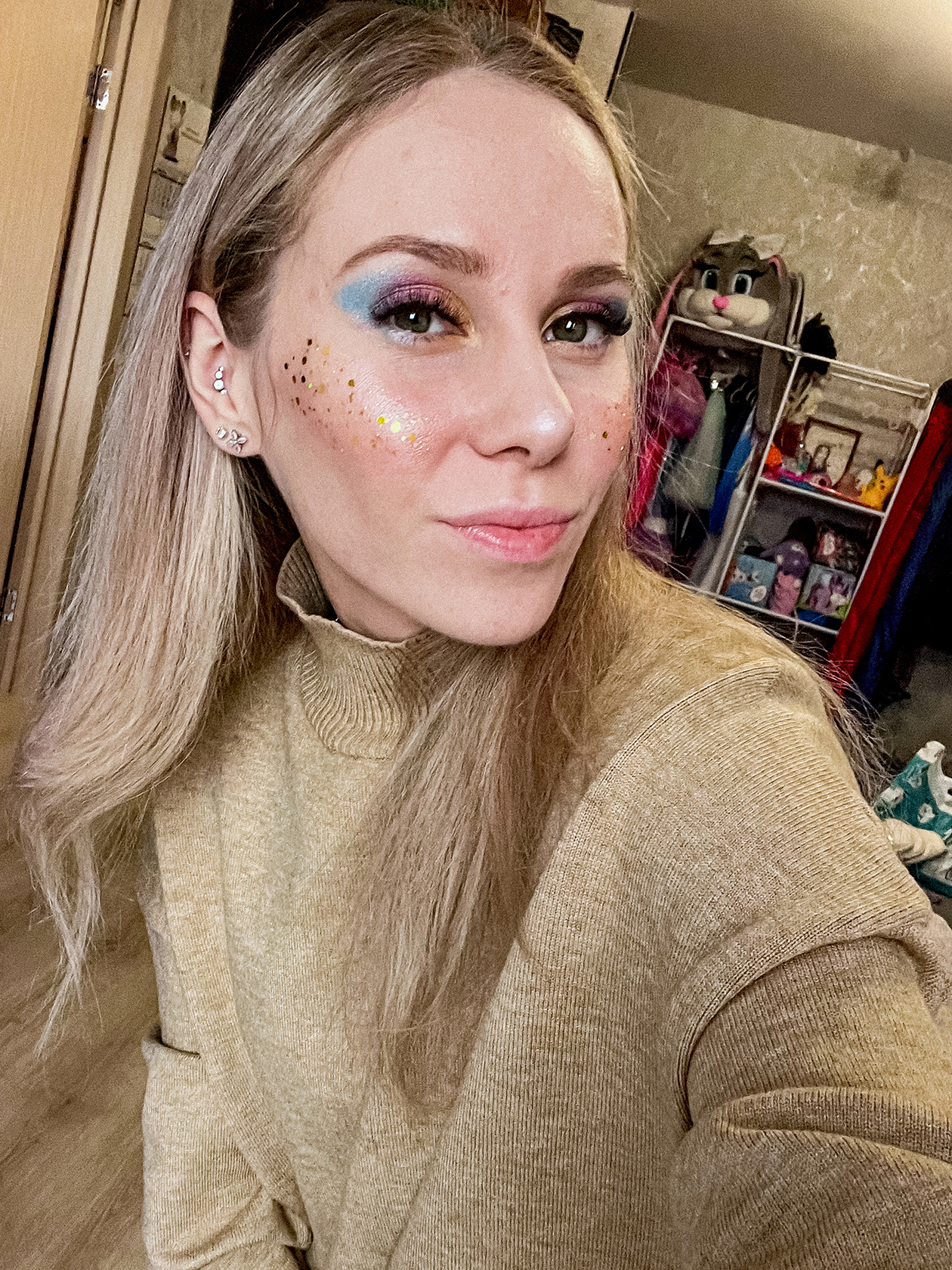 Краситься я нигде специально не училась. Все пришло с опытом и насмотренностью. Тем более в соцсетях часто попадаются видеоуроки и лайфхаки, стараюсь брать их на заметку. Для вдохновения могу посмотреть примеры макияжей на «Пинтересте», но обычно использую понятные идеи и ассоциации: для феи нужны розовые оттенки и цветочки, для Снегурочки — снежинки и белые блестки.