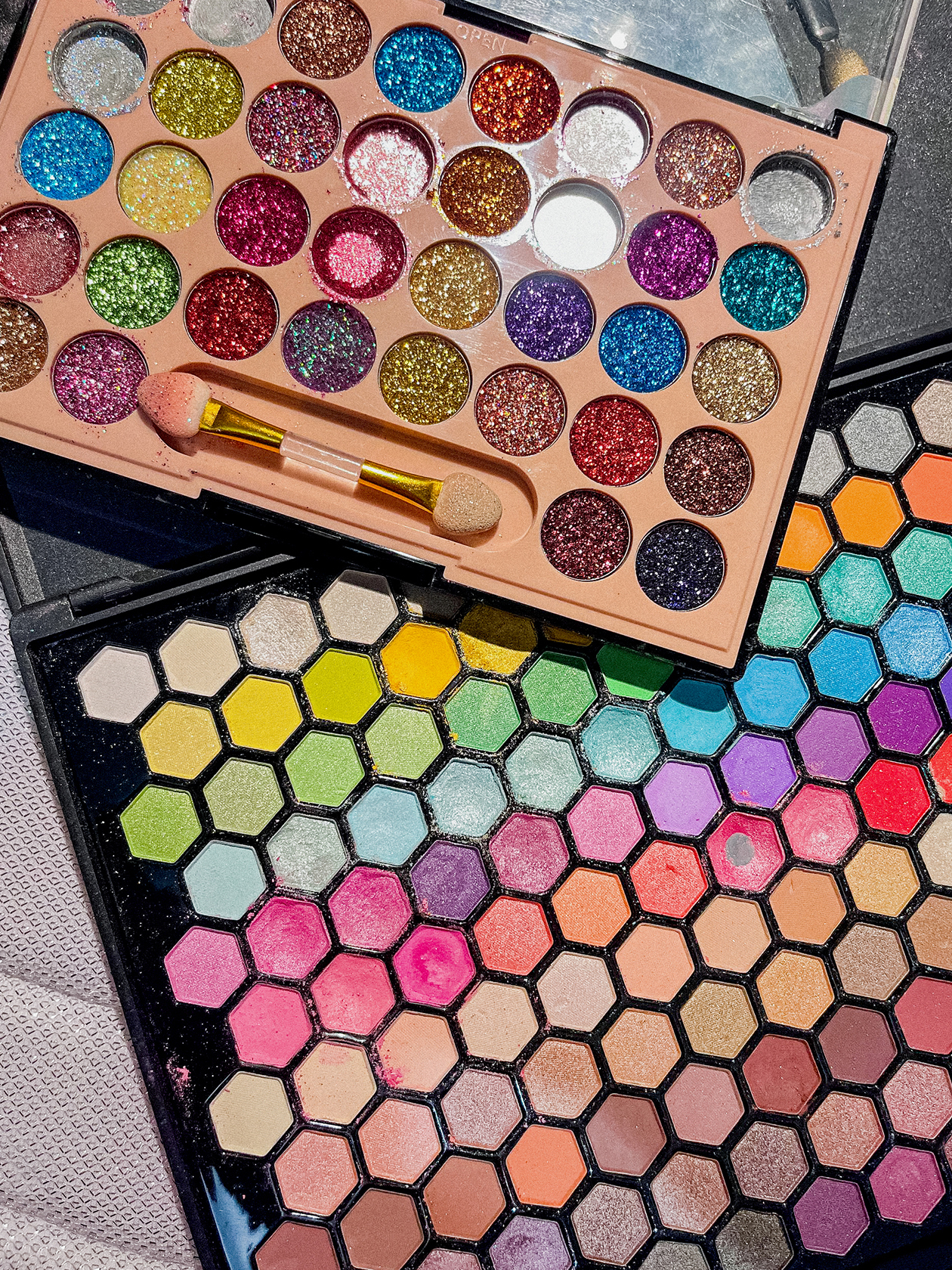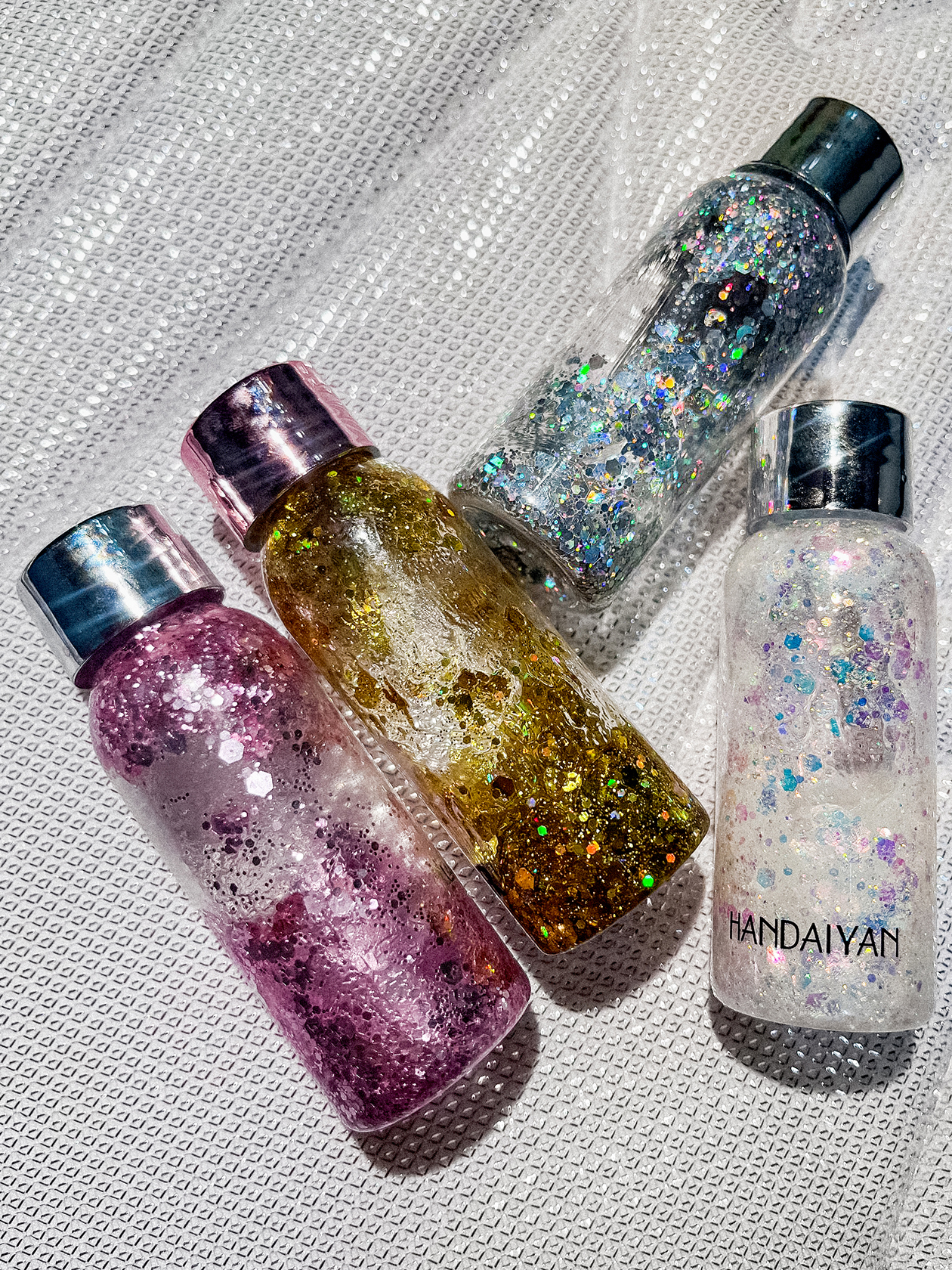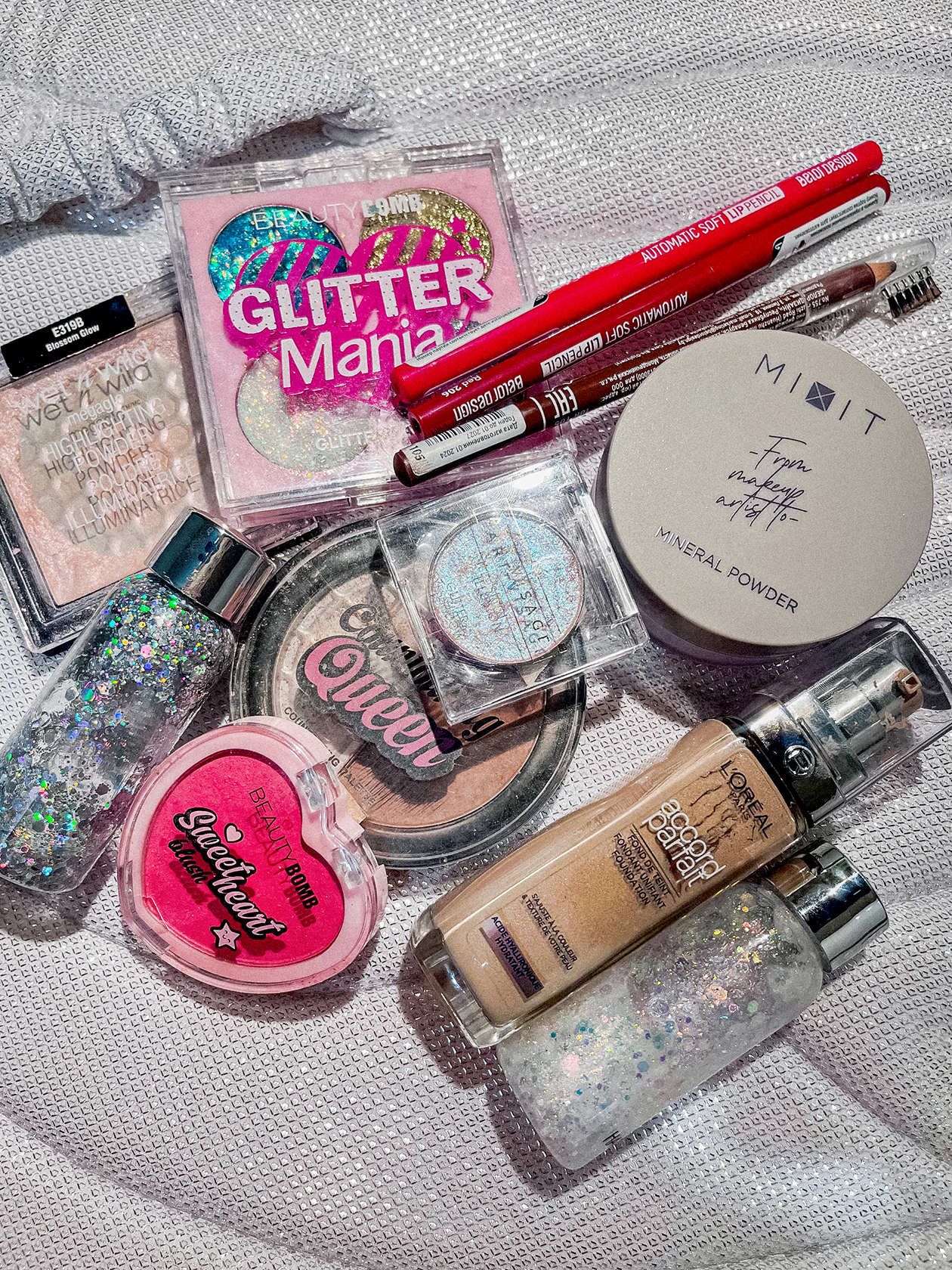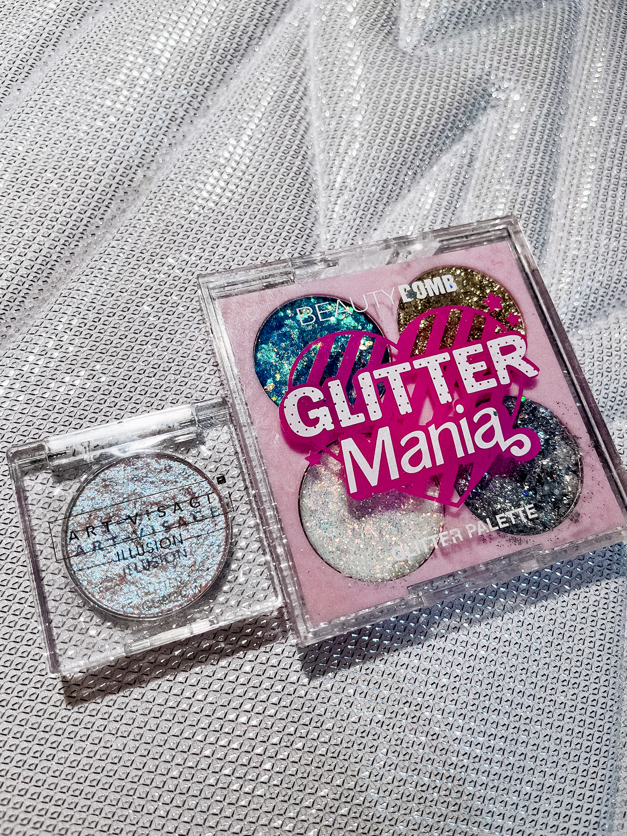Блестки и глиттер. Сейчас в ходу Beauty Bomb — Glitter Mania и Art Visage — Illusion. Они красиво переливаются и блестят на новогодних елках и от софитов на корпоративах, настоящая сказка. Вдобавок к ним использую глиттер в бутылочках с Wildberries от неизвестного бренда. На марки блесток обычно не смотрю, просто покупаю то, что хорошо сияет.