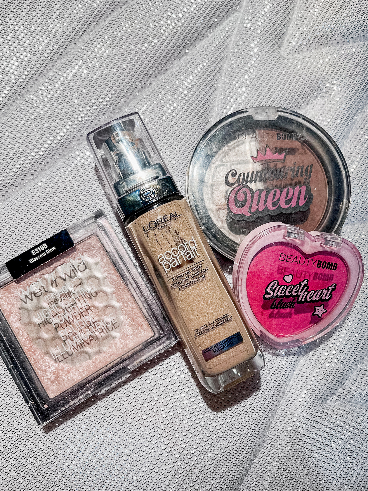 Контуринг и хайлайтер. Палетка Beauty Bomb — Countouring Queen со мной, наверное, с начала профессиональной деятельности и все никак не заканчивается. Прошла огонь, воду и медные трубы. Правда, закончилась половинка с хайлайтером, но его я заменила на Wet n Wild — MegaGlo, он волшебно мерцает.