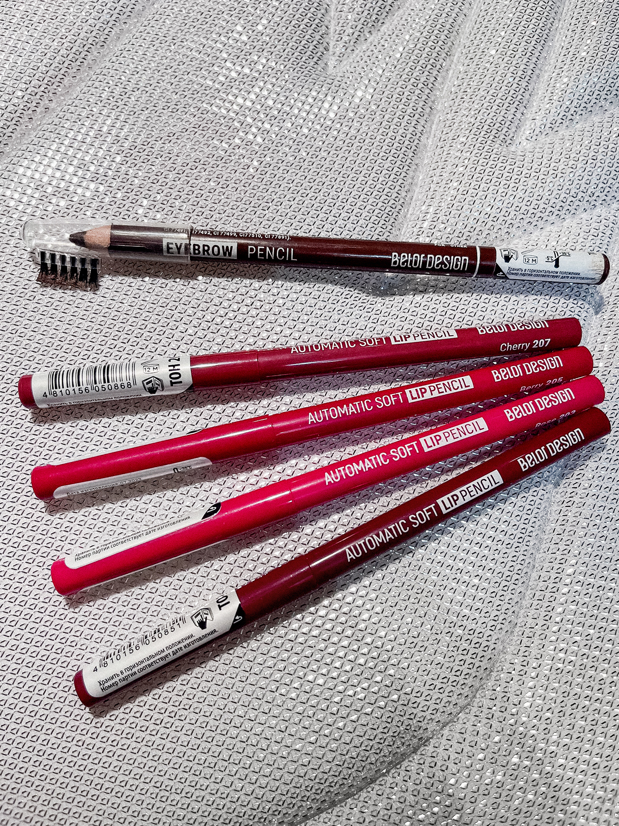 Карандаши для губ. Использую Belor Design — Automatic Soft. Рабочие продукты для губ должны быть матовыми и нелипкими, чтобы не пачкать парики и костюмы. Помады и блески обычно оставляют следы, так что крашусь только карандашом. Но чтобы губы блестели, сверху могу добавить сияющие тени в тон.
