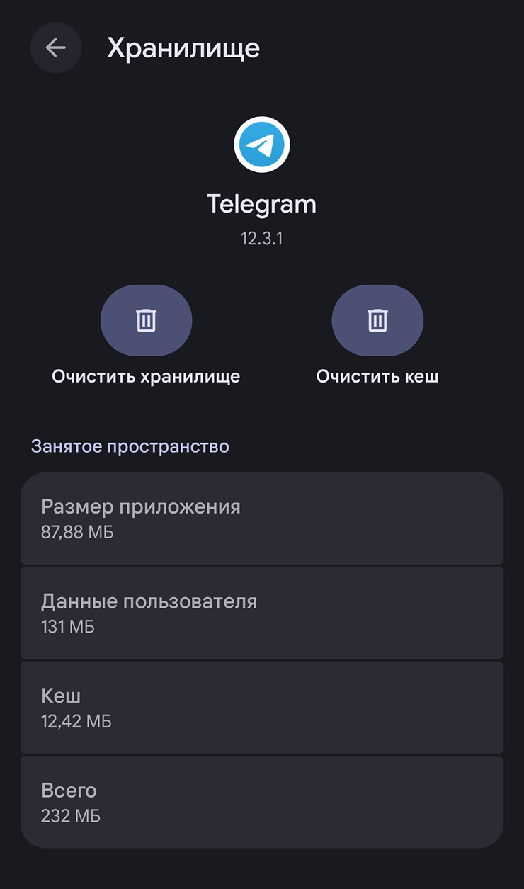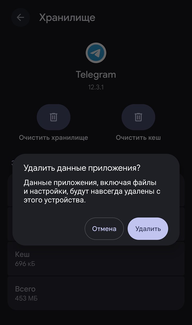 - «Очистить хранилище» — система удалит все пользовательские данные, будто приложение только установили на смартфон. Придется повторно зайти в аккаунт и выставить настройки.