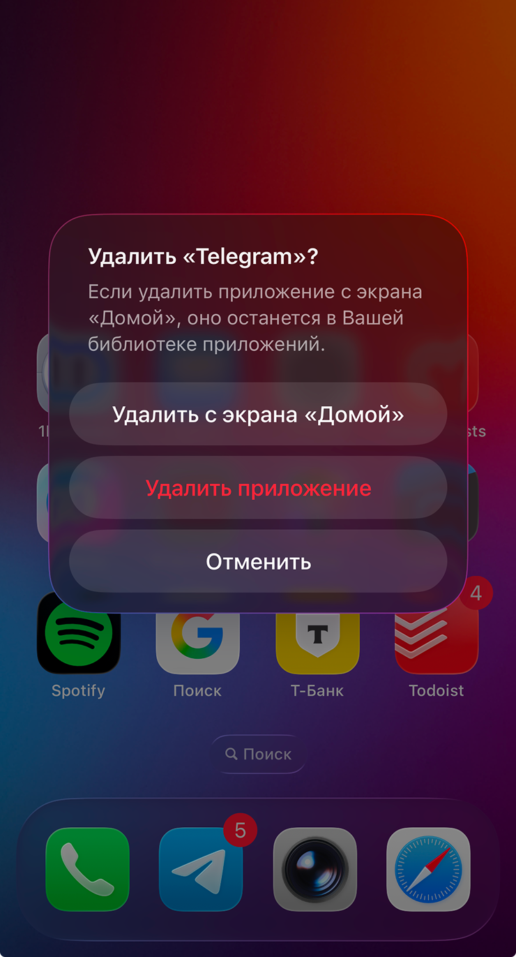Чтобы удалить «Телеграм» с Айфона, зажмите его иконку на рабочем столе и во всплывающем меню выберите «Удалить приложение», а затем подтвердите действие нажатием на кнопку «Удалить приложение».