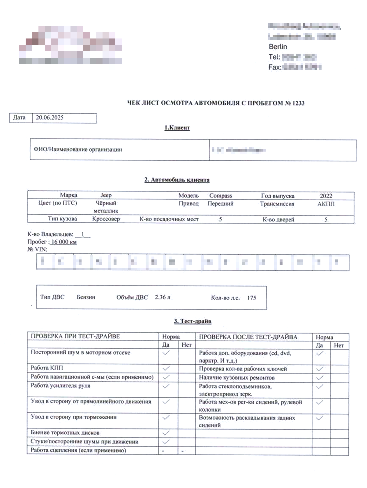 К договору приложили чек-лист осмотра джипа. Из нареканий — только потертые покрышки, остальное в пределах нормы. Диагностику сделали в Берлине. Есть печать и подпись, все как положено. Я подписал бумаги и стал ждать, когда из Германии прискачет мой железный конь.