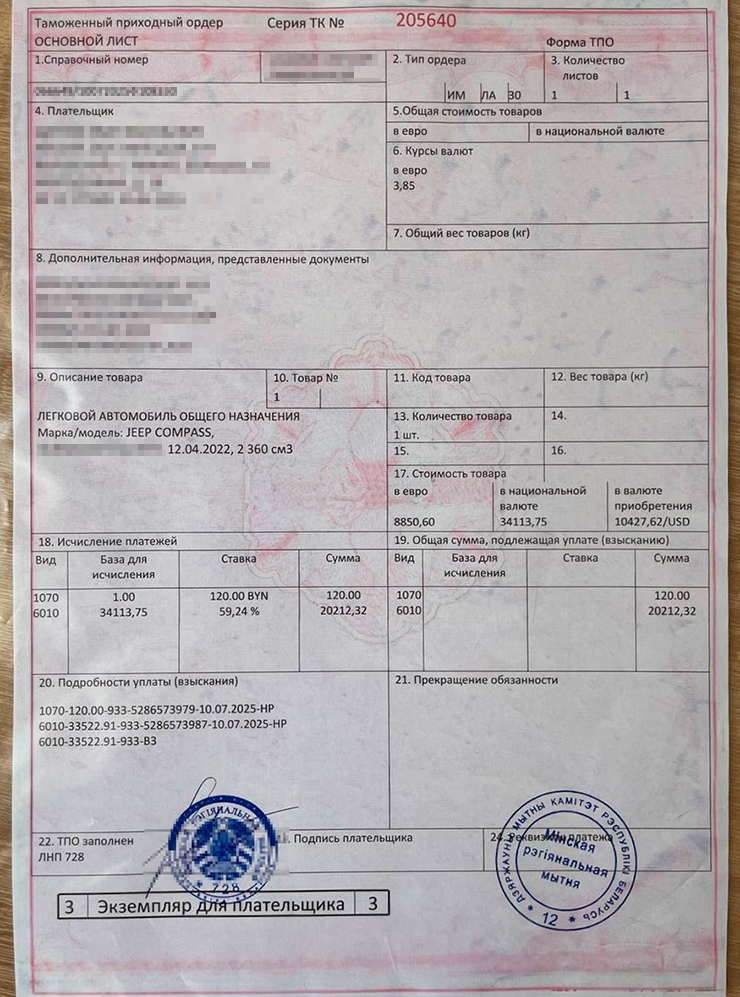 Менеджер Денис держал в курсе всех гипотетических передвижений автомобиля: вот он якобы выдвинулся из Германии, уже в Литве, едет через Польшу. На белорусскую таможню прибыл 11 июля, спустя семь дней после заказа, как и обещали. Меня попросили перевести 486 569 ₽ на счет таможенного брокера.
