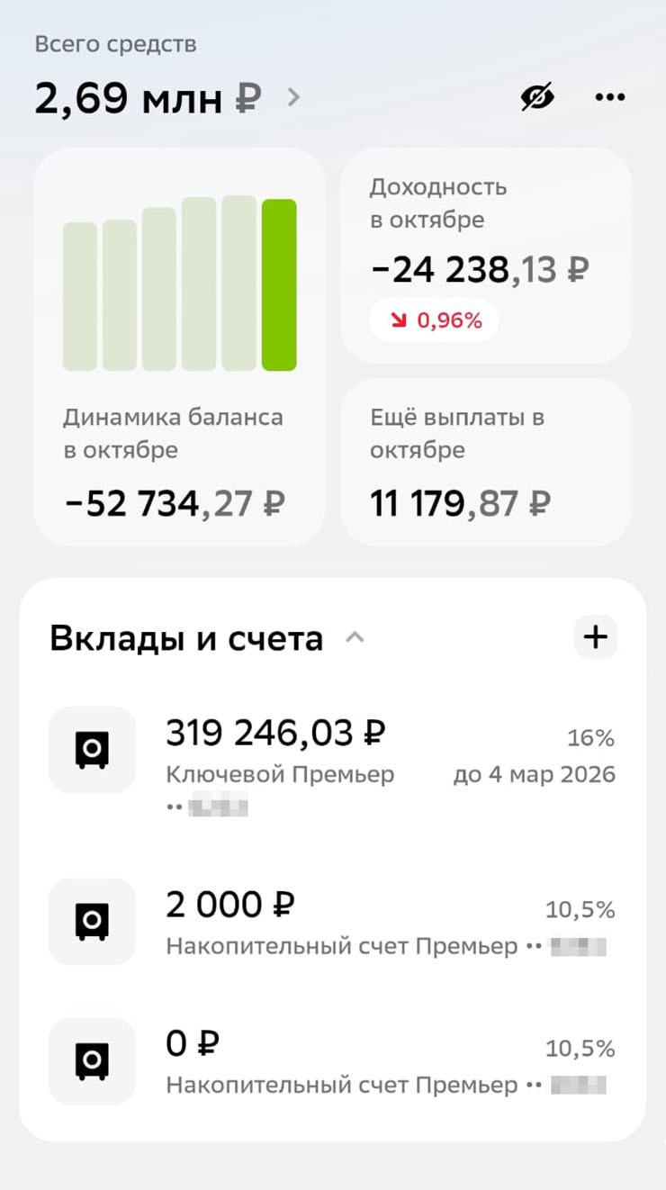 Сколько накопил: откладываю с 2020 года, когда еще в студенчестве подрабатывал курьером в «Деливери». Сейчас у меня на брокерском счете 5,7 млн рублей: 60% — в замещающих облигациях, 40% — в акциях РФ. Плюс с 2022 года заморожены ценные бумаги на сумму 800 000 ₽ — в основном проклятый FinEx.