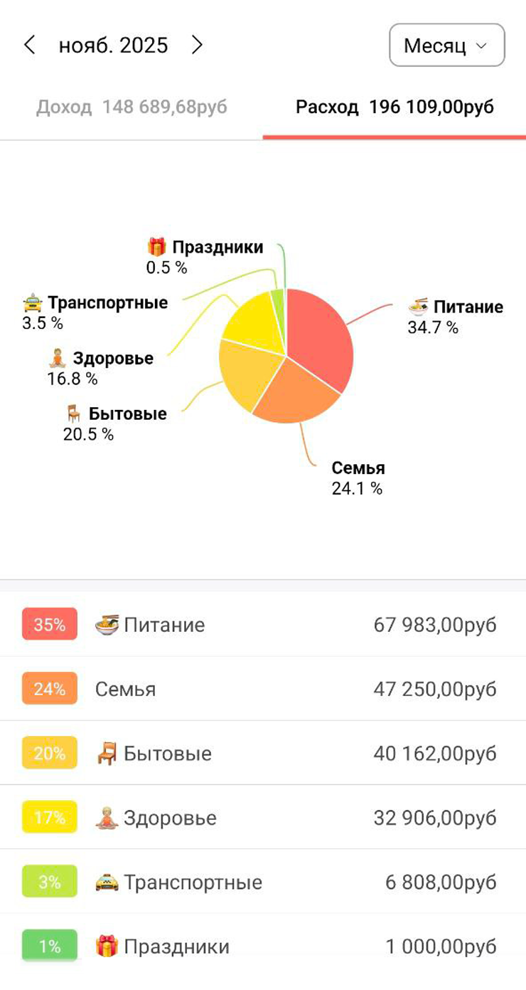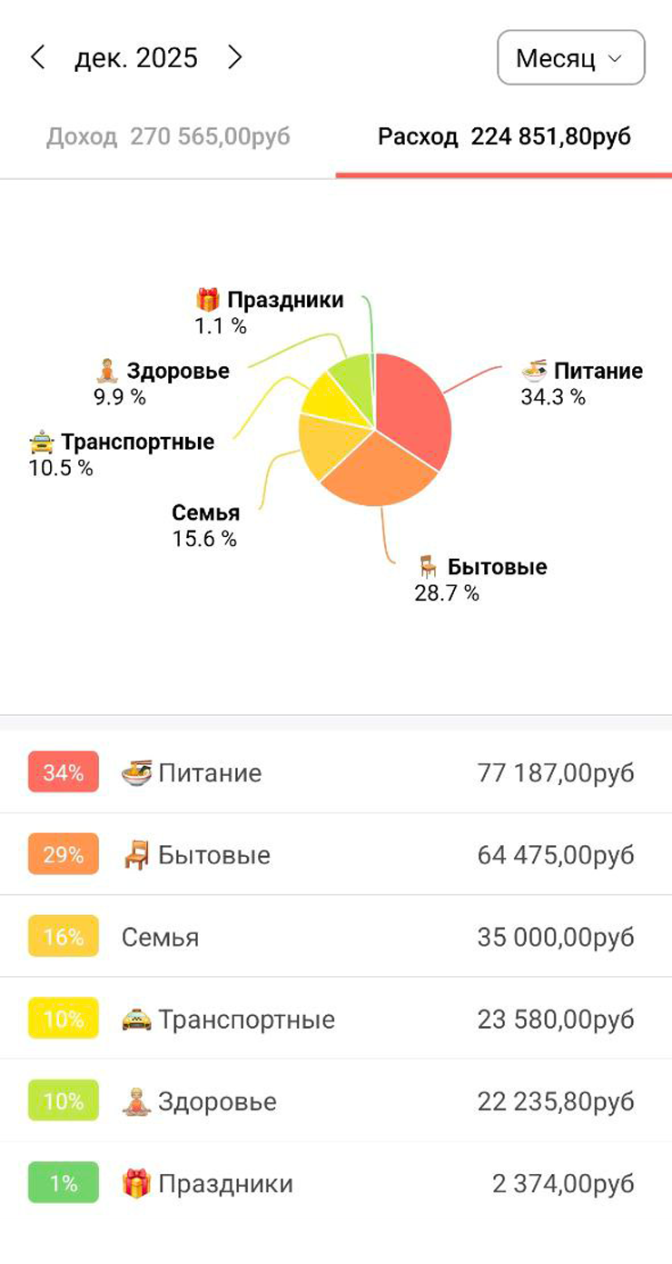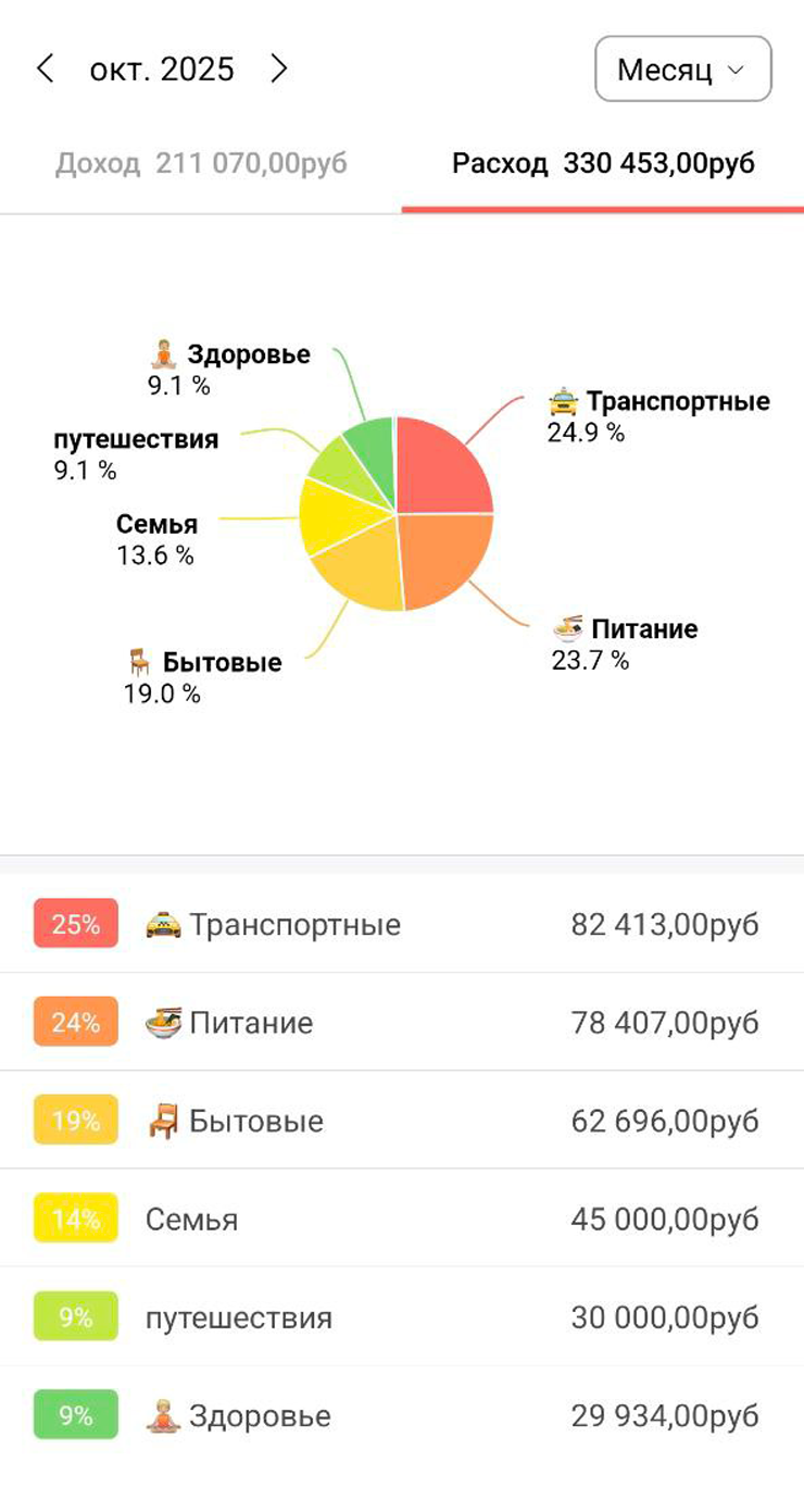 Бюджет у нас раздельный, но у жены сейчас нет источников дохода, поэтому можно сказать, что он общий. Регулярные расходы составляют порядка 180 000 ₽ в месяц.