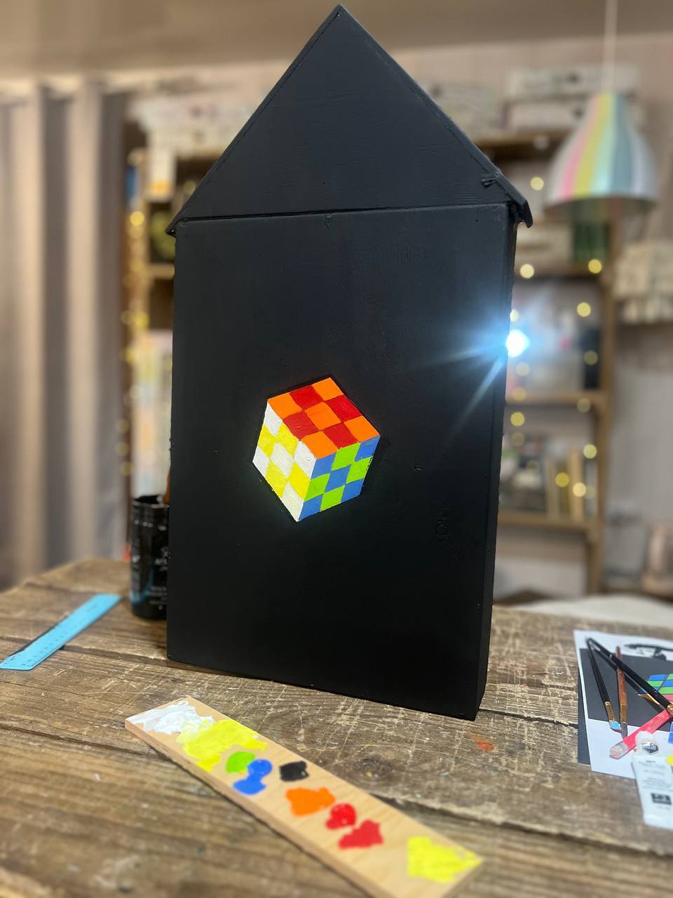А потом мы поставили готовый стеллаж на стол и вложили в ячейку первый кубик. Чёрный домик с яркими головоломками выглядел… мрачно. Больше похоже на музейную витрину для артефактов, чем на экспонат детского конкурса.