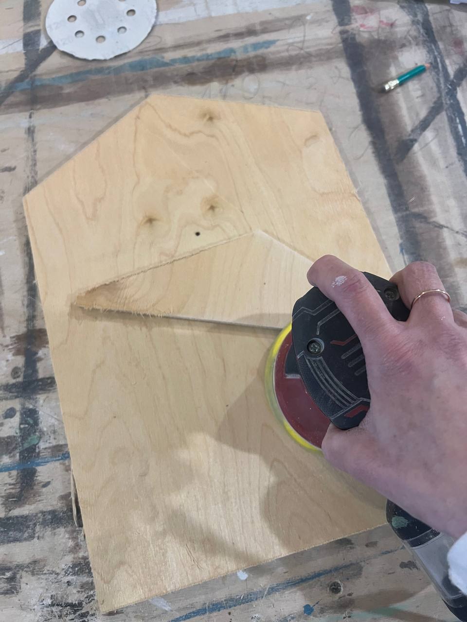 Я обработал все двенадцать деталей эксцентриковой шлифмашинкой — сначала зерно 120, затем 180. Плоскости — машинкой, кромки и внутренние углы — вручную мелкой наждачной бумагой. На весь комплект ушёл примерно час.