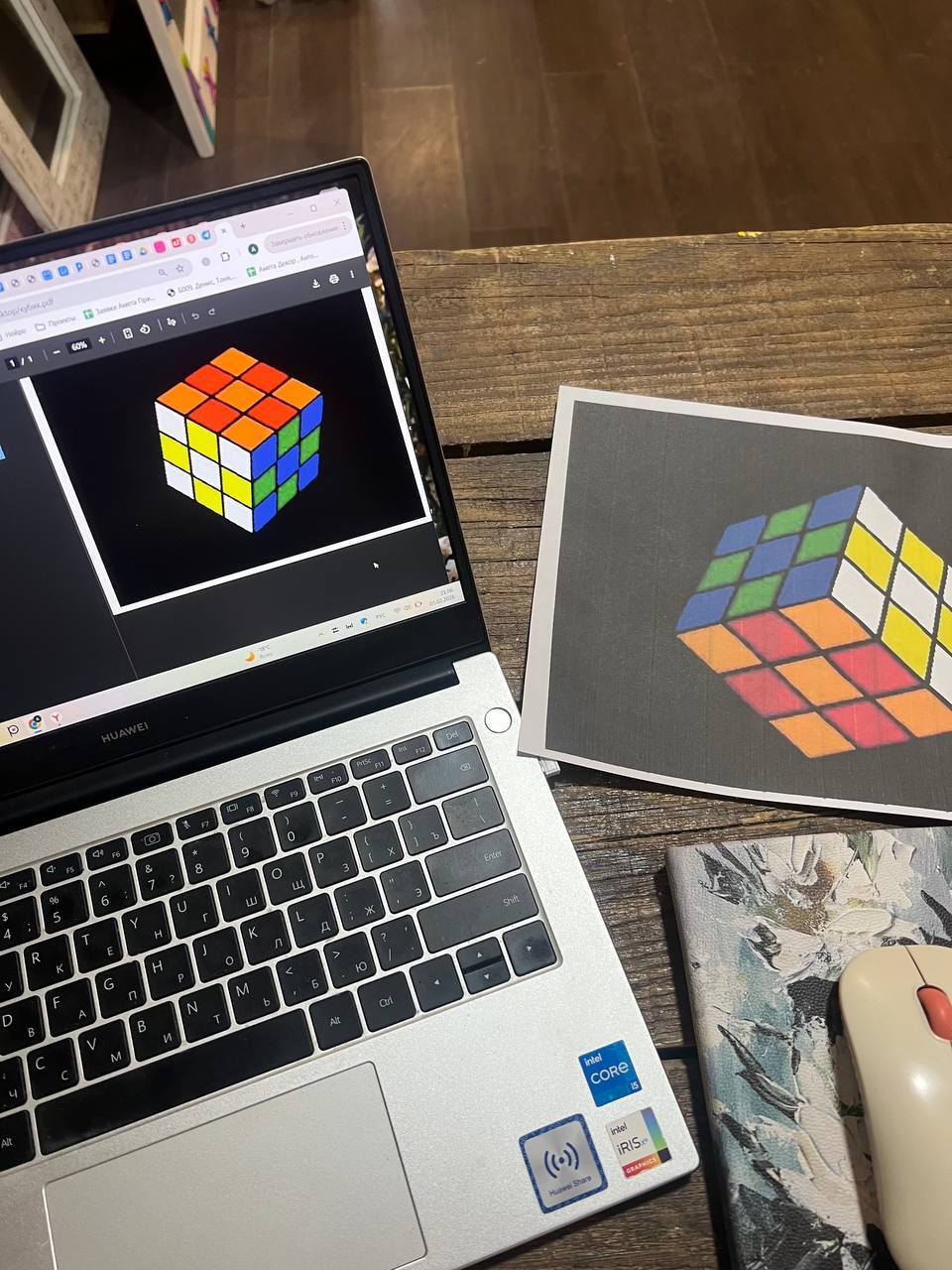 Здесь основную работу выполняла коллега-декоратор, я помогал с подготовкой. Нашли референс кубика Рубика в изометрической проекции, распечатали на листе А4, перенесли контуры карандашом на заднюю стенку стеллажа по координатной сетке.