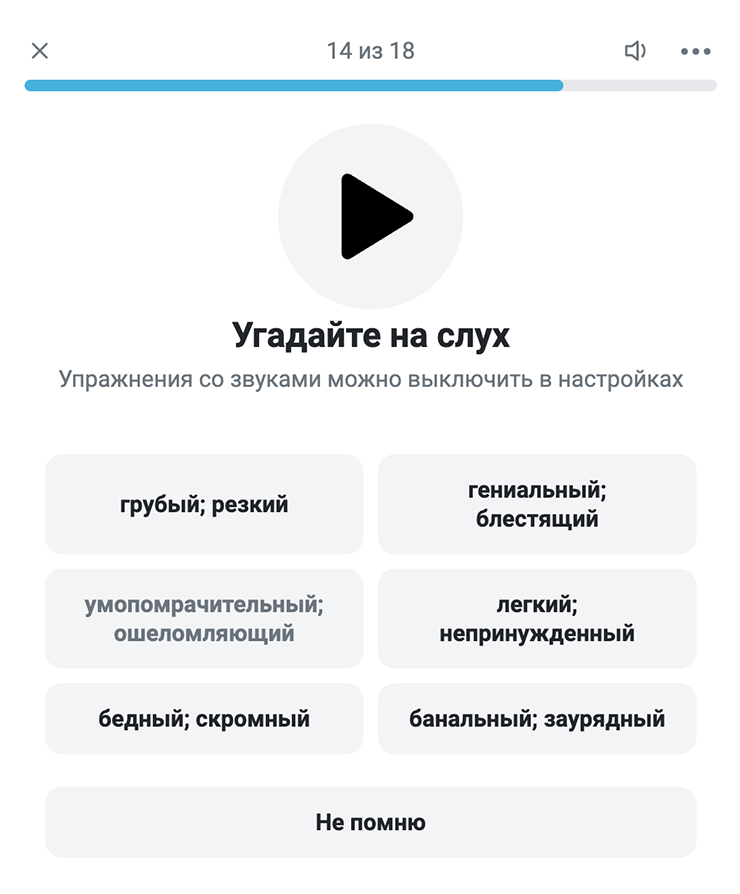 Отдельно похвалю дизайн карточек, в них очень много информации: перевод, несколько иллюстраций-гифок, транскрипция, примеры использования и произношения. Запомнить незнакомое слово становится очень просто.