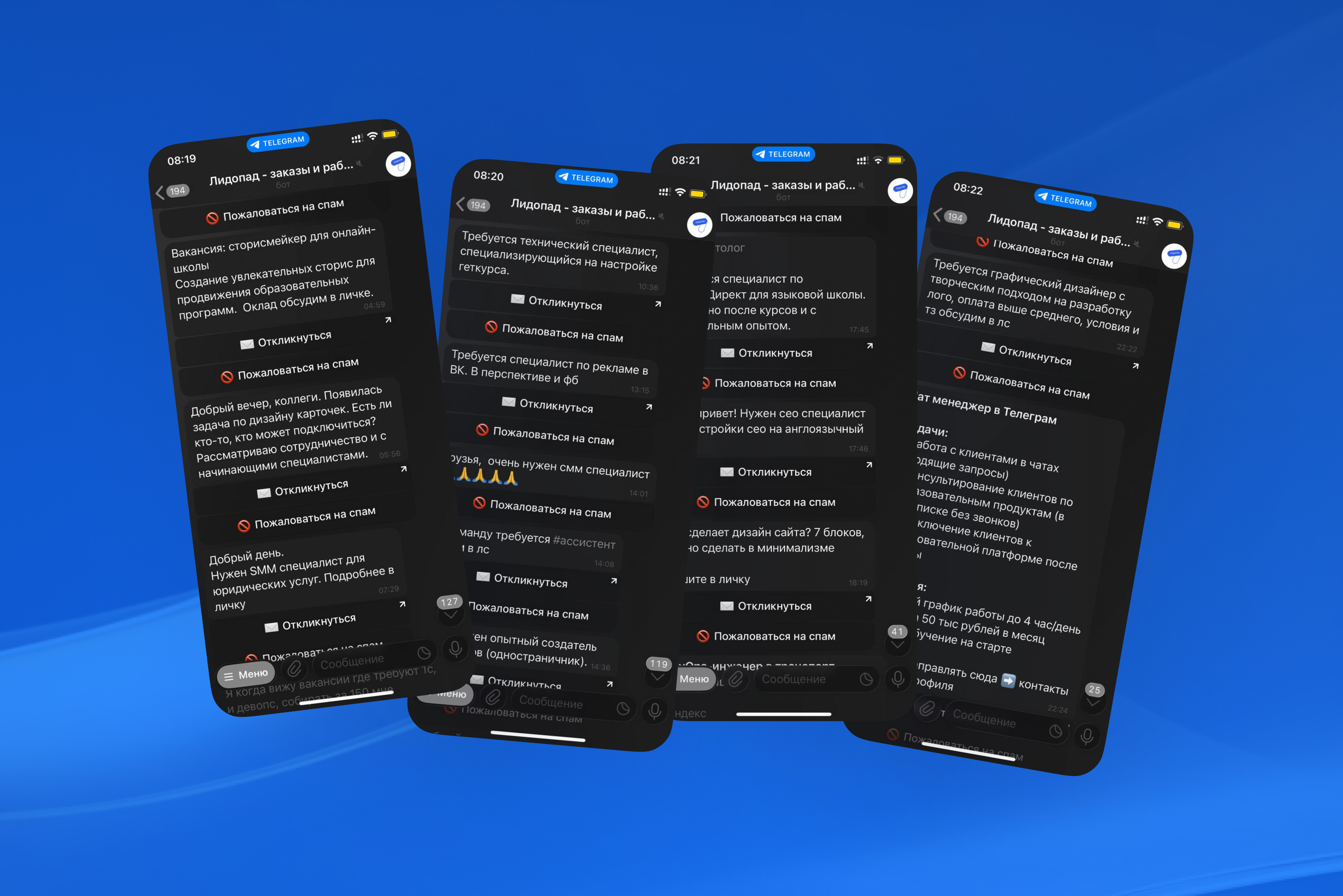 Как это работает. Каждый день в чатах Telegram появляются тысячи заказов и запросов по поиску различных специалистов. Сервис автоматически сканирует эти сообщения в чатах.