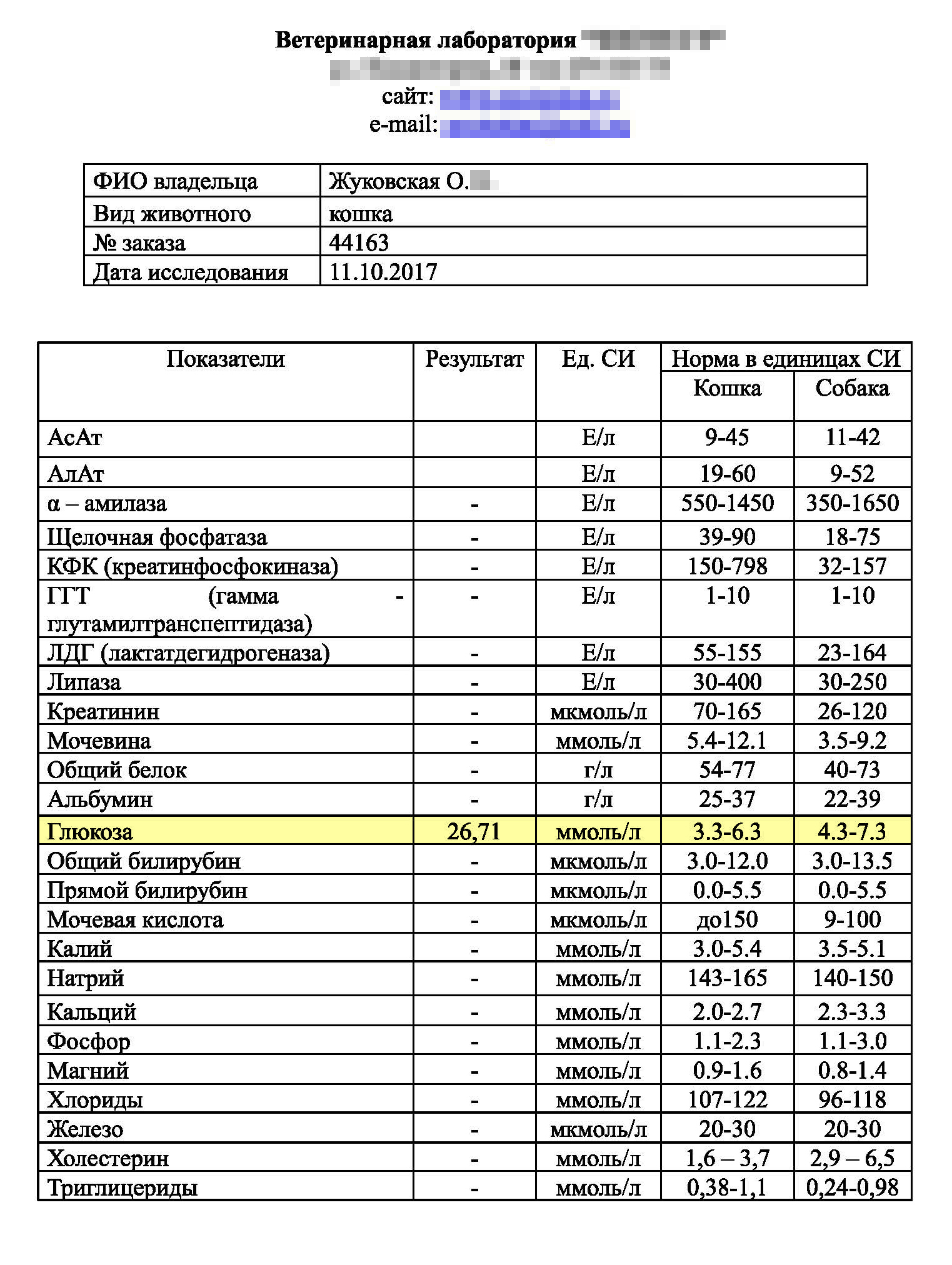 Результаты анализа пришли на следующий день. Уровень сахара в моче оказался более 56 ммоль/л, хотя в норме его быть вообще не должно. Дежурный врач сказал, что у кота сахарный диабет, но опыта лечения таких животных у него не было.