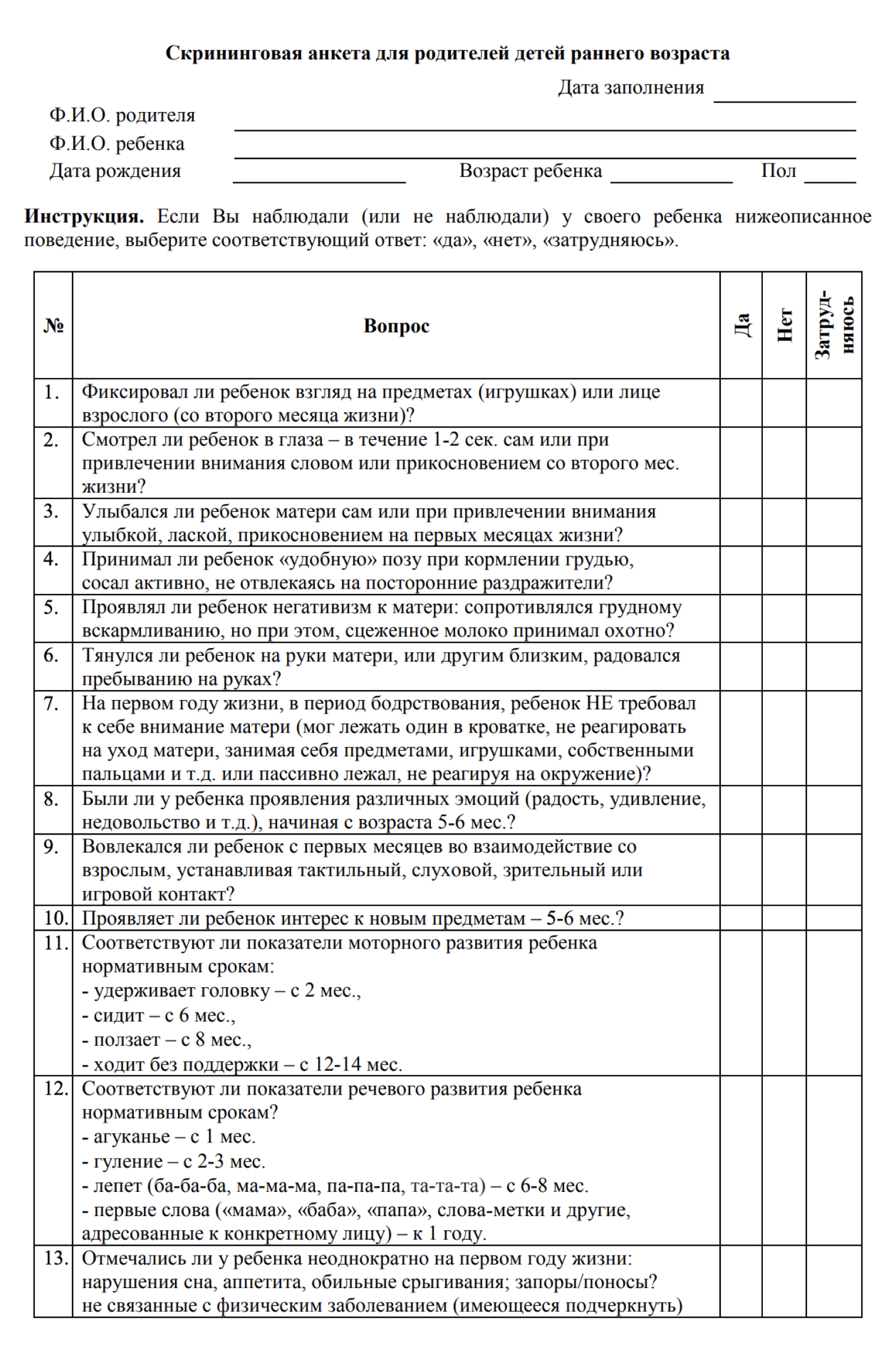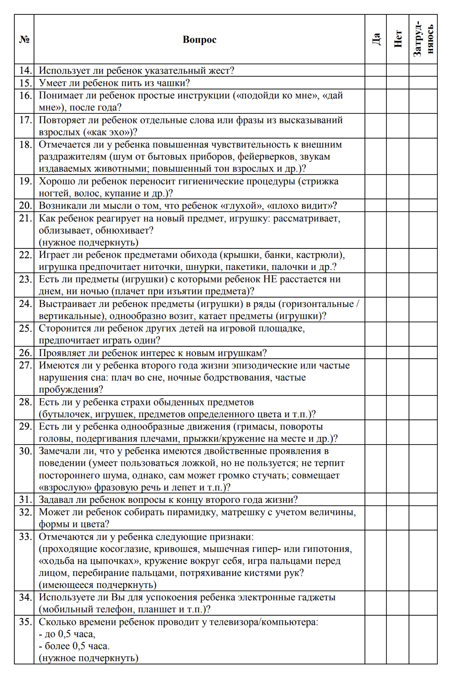 Для ранней самодиагностики можно использовать M-CHAT-R/F — это наиболее эффективный и изученный тест для оценки риска РАС у детей 16—30 месяцев. Результаты опроса, показывающие высокий риск, — еще не диагноз, но повод посоветоваться с врачом.