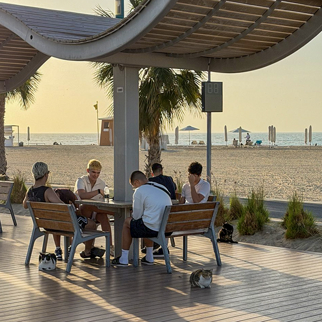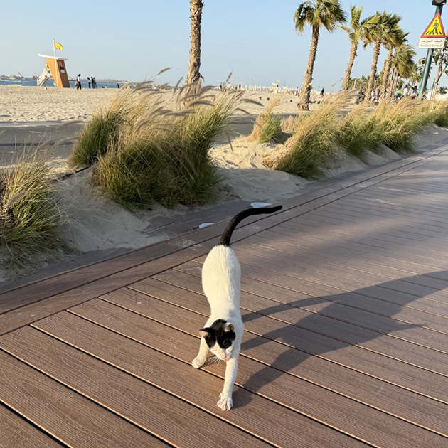На пляже сегодня о-о-очень много народу. Когда я только переехала в Дубай, Кайт-бич был не настолько популярен у туристов — тут были в основном резиденты. Сейчас в выходные тут жесть, но если пройти чуть дальше к парусу, то становится заметно свободнее. Еще вижу по пути много котеек, их тут подкармливают.