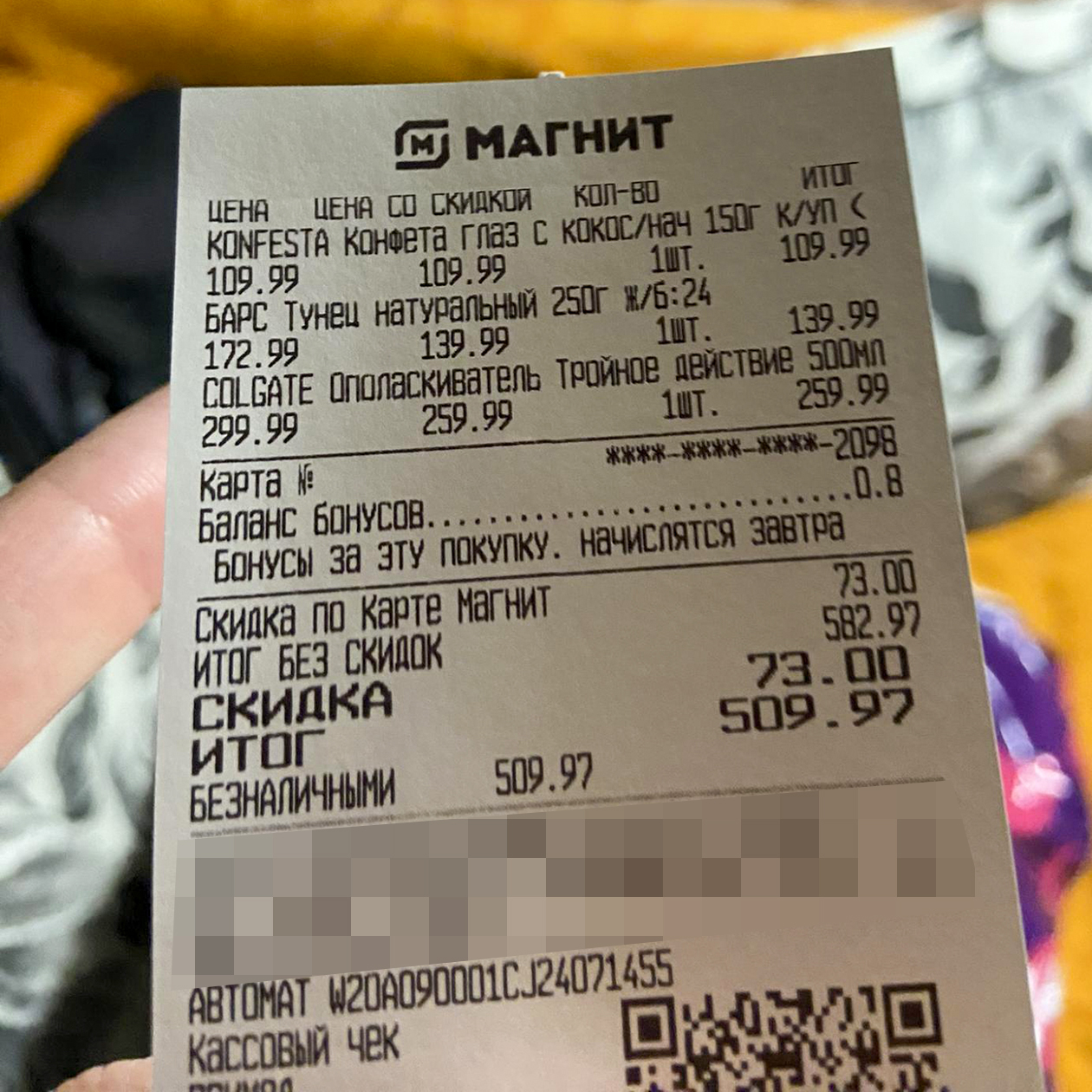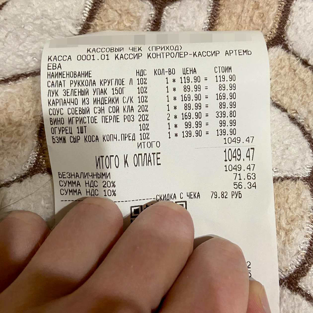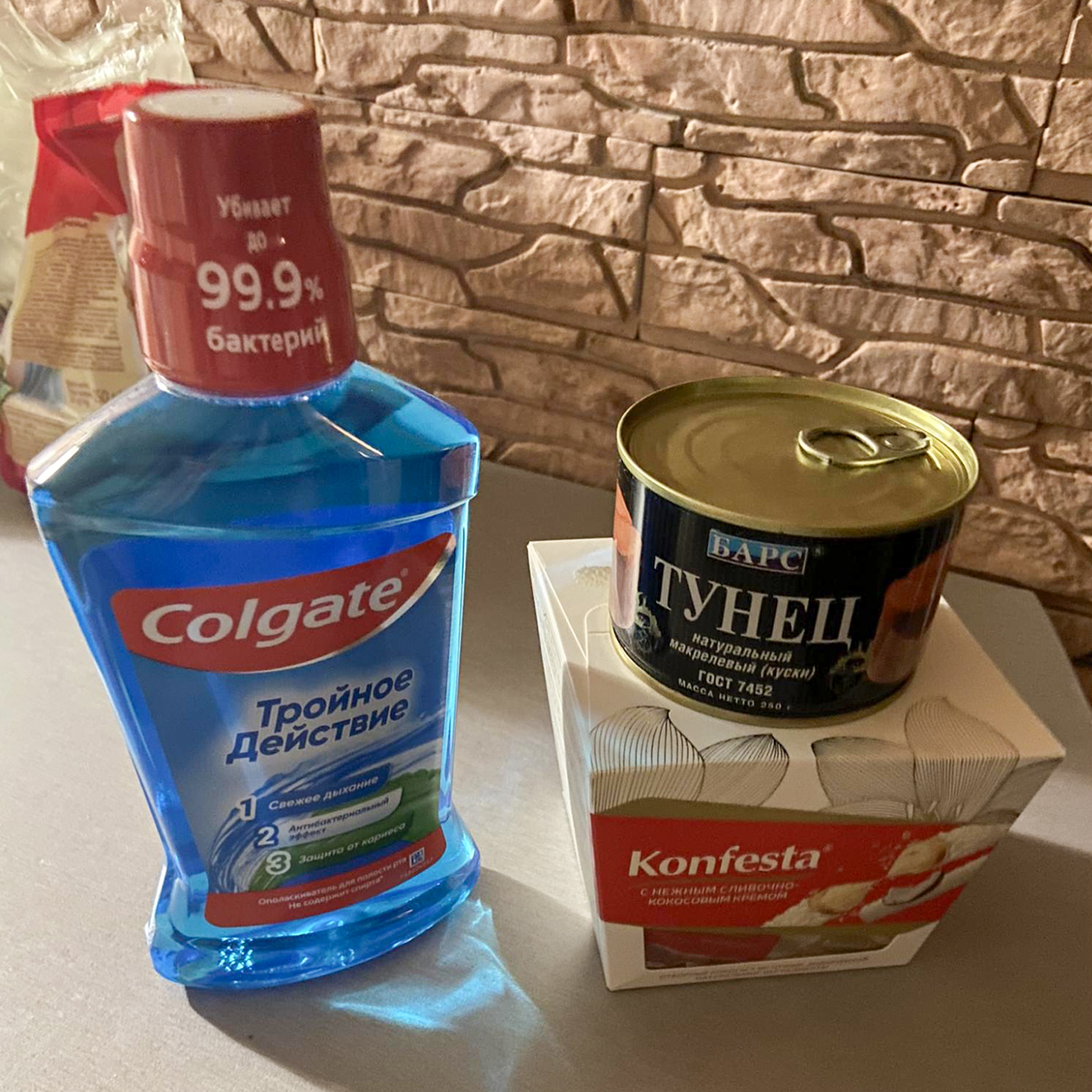 19:48. Купил ополаскиватель для рта: Т. подкалывает из-за запаха уже второй день. Еще взял тунца в банке и конфеты. −510 ₽