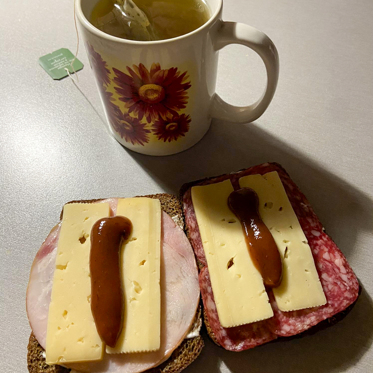 20:48. Пора и поесть. Для начала — творог со сметаной и вареньем, а потом — бутерброды с чаем.