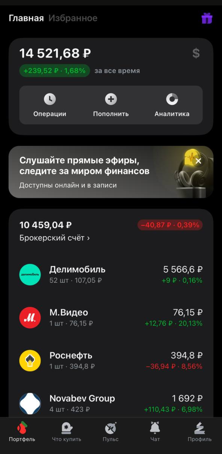 Сейчас на брокерском счете у меня около 10 400 ₽. Регулярно покупаю акции фонда «Крупнейшие компании РФ», особенно когда они падают в цене. Также купил 51 акцию «Делимобиля», чтобы у меня был неограниченный премиум-аккаунт. Закупился по 106 ₽ за штуку, сейчас они торгуются по 120 ₽. К сожалению, это самая удачная инвестиция на текущий момент.