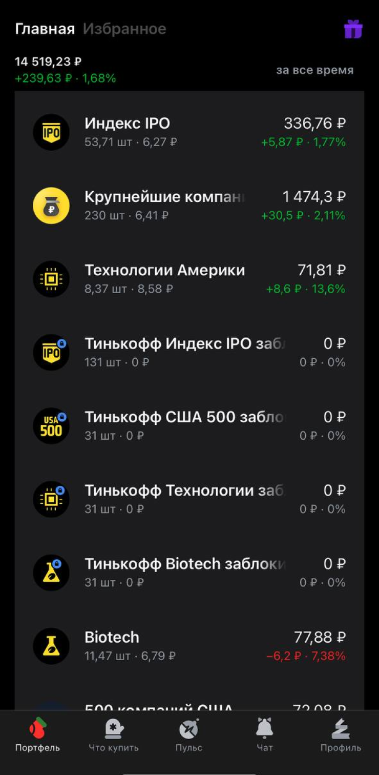 Инвестиции: инвестирую через Т-Инвестиции. Зарегистрирован еще в «Альфа-инвестициях», так как там заманивали бесплатными акциями.