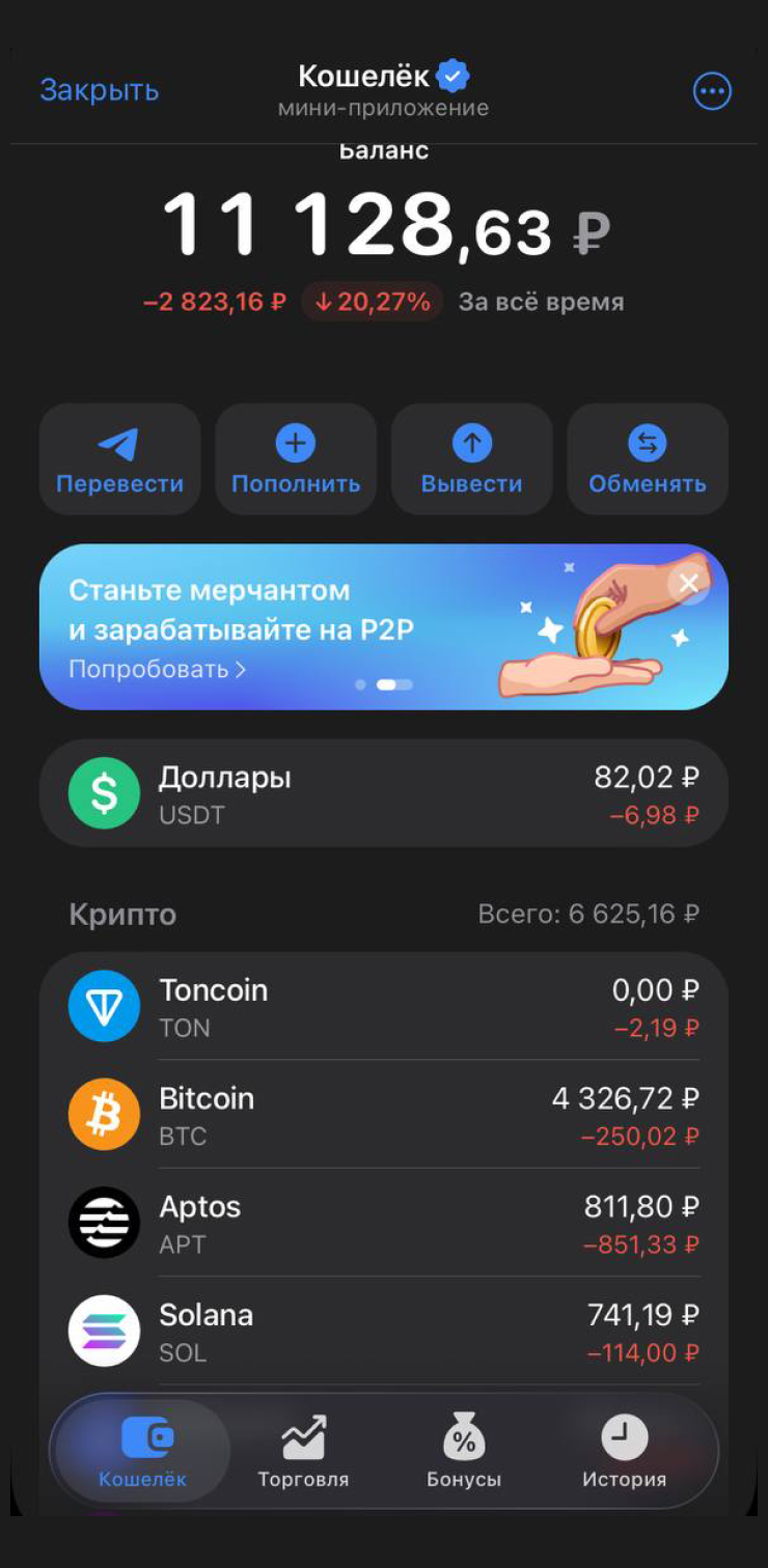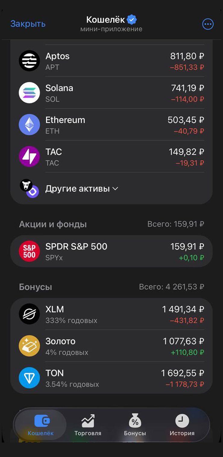 Еще немножечко пытаюсь в криптовалюту, но это выглядит очень наивно: совершаю все операции в криптовалютном кошельке в «Телеграме». Там у меня 10 680 ₽ по текущим курсам. Правда, из-за изменений в законе по поводу банковских переводов, наверное, дальше заниматься этим не стоит.