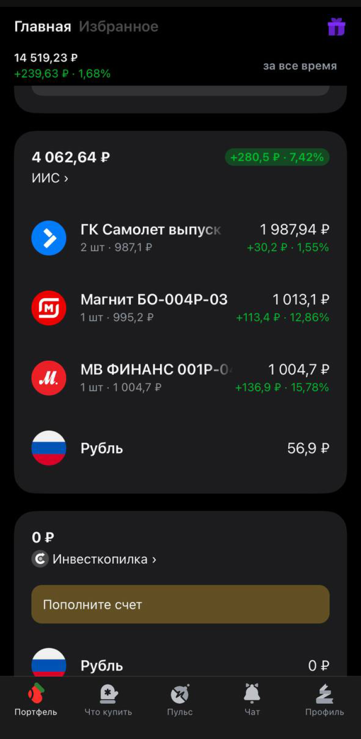 Есть ИИС, но там скромненько — 4 107 ₽. Покупаю только облигации.