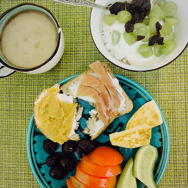 06:25. Окончательно просыпаюсь, готовлю завтрак. Сегодня снова лепешка из остатков вчерашнего теста. Как раз хватает на одну лепешку, промазываю ее внутри арахисовой пастой. И каждому накладываю по пиале творога со сметаной, кефиром, медом и вареньем.