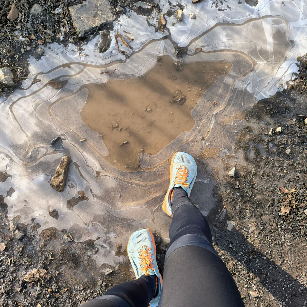 07:50. Идем на электричку. На улице не слишком холодно, даже льда на лужах нет. Ну и мы в пуховиках, это надежнее, чем отсутствующий лед. Вечером я планирую побегать на стадионе, для этого надела кроссовки для быстрого бега, и выглядят они ярко. При этом из них торчат ноги в шерстяных колготках, а еще выше — шерстяное платье и пуховик. I’m sexy and I know it.