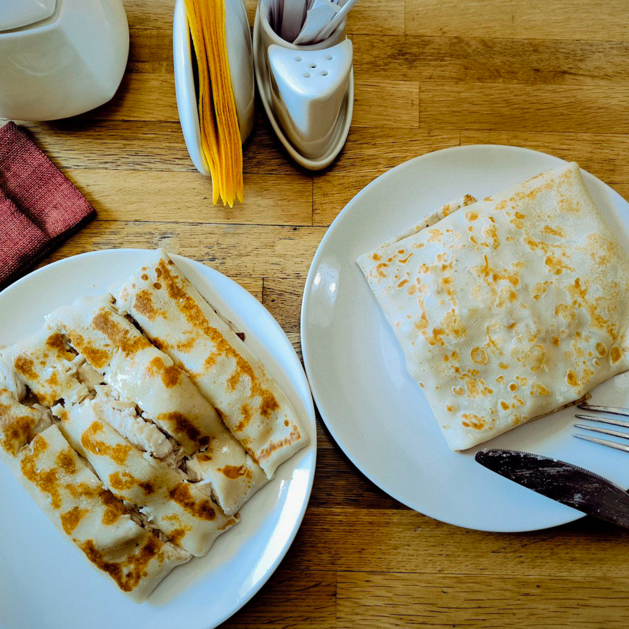 13:00. Иду на обед. Сегодня хочется не своей стряпни, а чего-то кафешного. Выбрала блинную, бываю здесь раз в месяц-два. Готовят вкусно, сытно, много начинки. Всегда беру блин с куриной грудкой и блин с печеным яблоком, сегодняшний день не стал исключением. −400 ₽