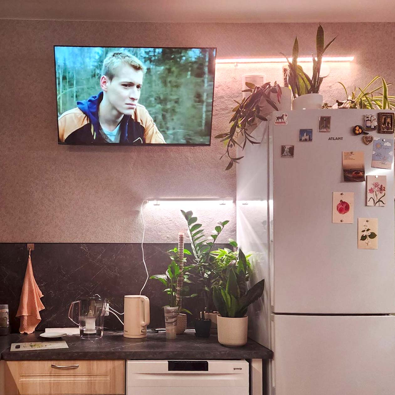 Ужинаем. Затем я поливаю цветы. Парень идет в соседний корпус за черенком диффенбахии, который нам отдают просто так. Перемещаю вещи в сушильную машину.