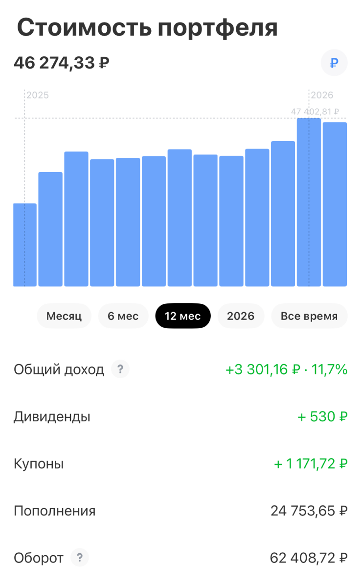 Когда я следила за всем этим мракобесием чуть ли не каждый день, портфель стабильно был в плюсе на 1—2%, что меня, как абсолютного нуба в инвестициях, безусловно, радовало.
